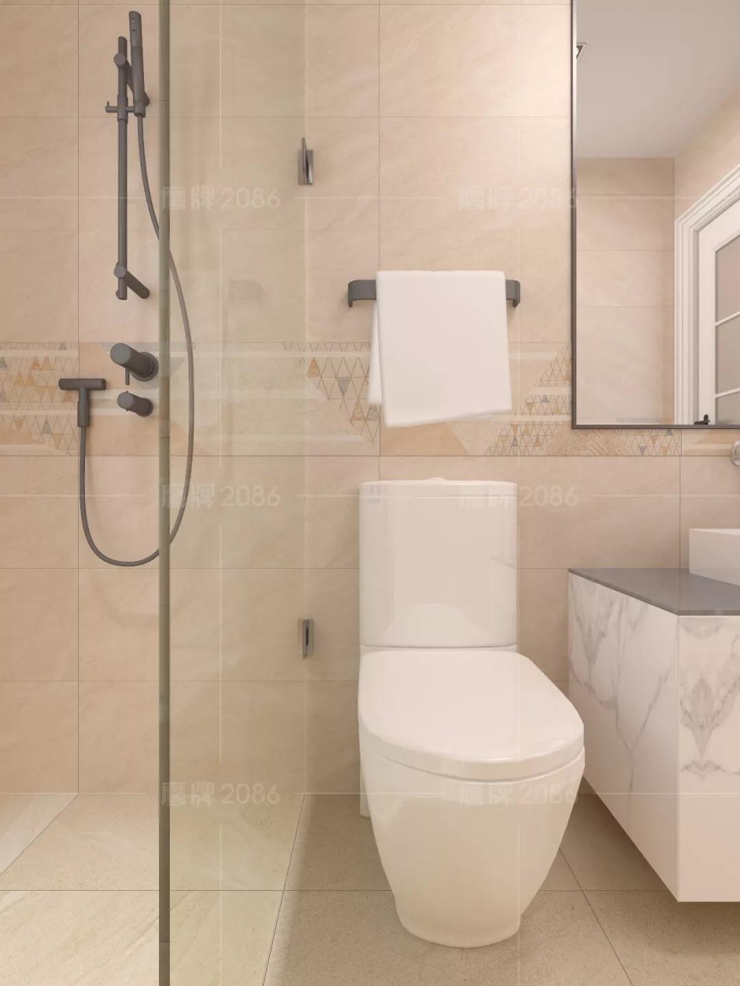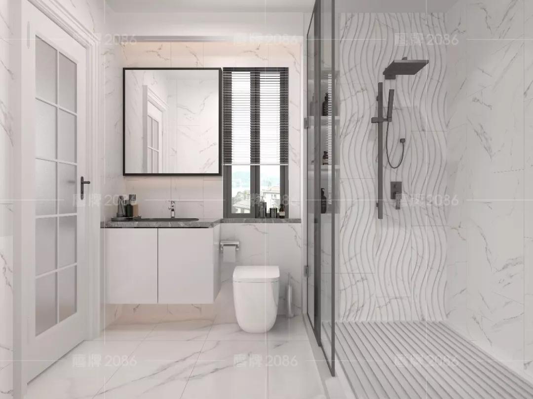 主卫和次卫分别为白色调和暖黄色调,白色调优雅纯净,流畅线条与大理石纹理结合,小空间却显大气奔放。暖黄色调温馨浪漫,跳动的几何和小色块,更显轻松与可爱,空间充满开心愉悦的泡泡。