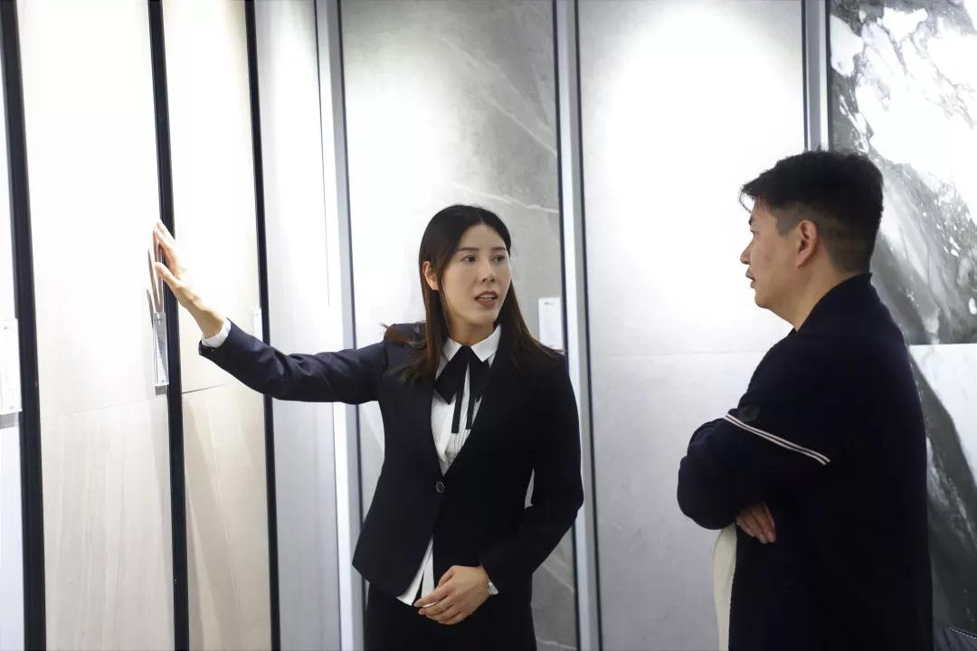 瓷砖本身是一种冷冰冰的产品,需要销售人员借助外力去传递它所带出来的温度。比如说,在描述“糖果干粒半抛”这个专业工艺名词的时候,把它说成“在光的照射下,瓷砖表面会呈现星光闪闪的视觉效果”会更加通俗易懂。