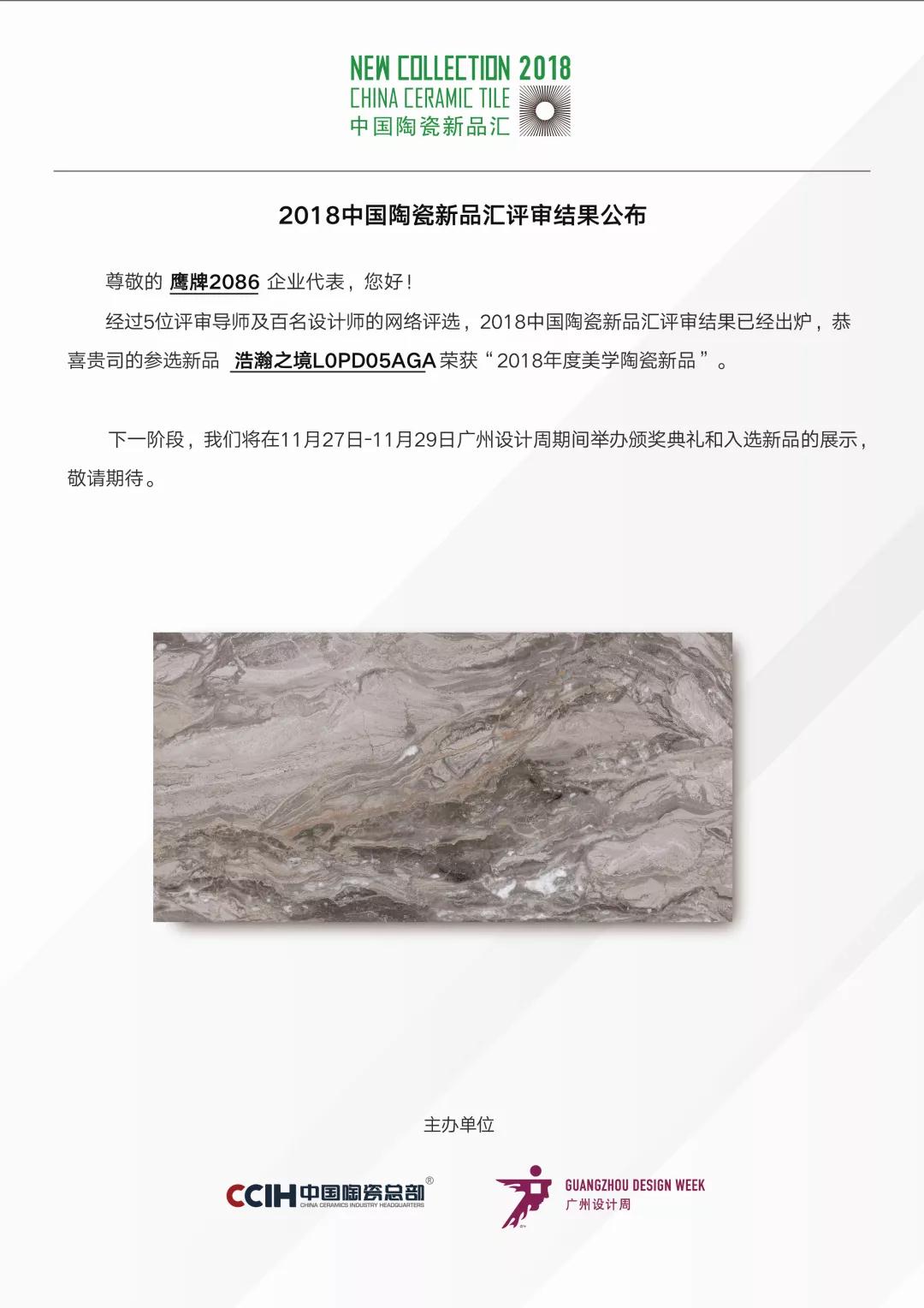 鹰牌2086获奖新品“浩瀚之境”亮相广州设计周,进行为期三日的展示,11月27日-29日在广州·琶洲·保利世贸博览馆,广州设计周1号馆1D28中国陶瓷总部展位 ,期待您的鉴赏!