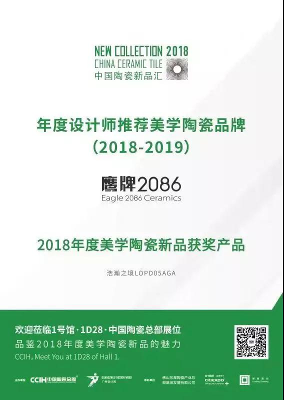 经过专业评审团在线评选、导师评审团现场评审等一系列的考验,鹰牌2086凭借独特创新的产品以及高度的空间适配性,荣获“2018年度美学陶瓷新品”、“年度设计师推荐美学陶瓷品牌”两大奖项!
