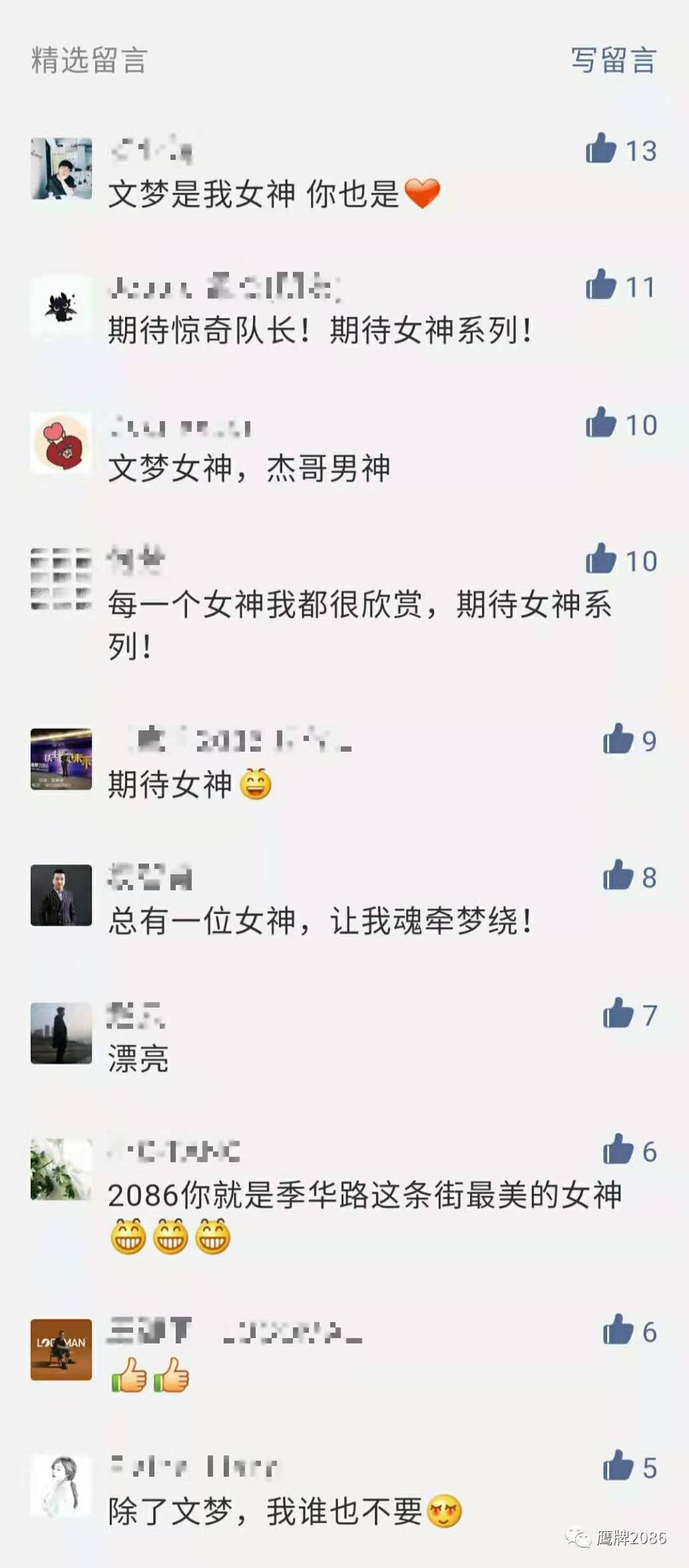 上期《在最好的时代,做自己的女神》文章中,参与留言的小伙伴纷纷对自己心中的“女神”表白,鹰牌2086选出留言点赞数较多的前十位,送出精美礼品一份!恭喜以下十位可爱的小粉丝: