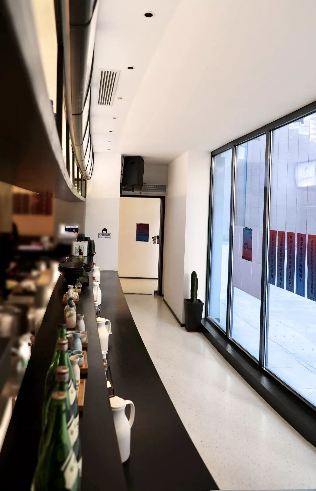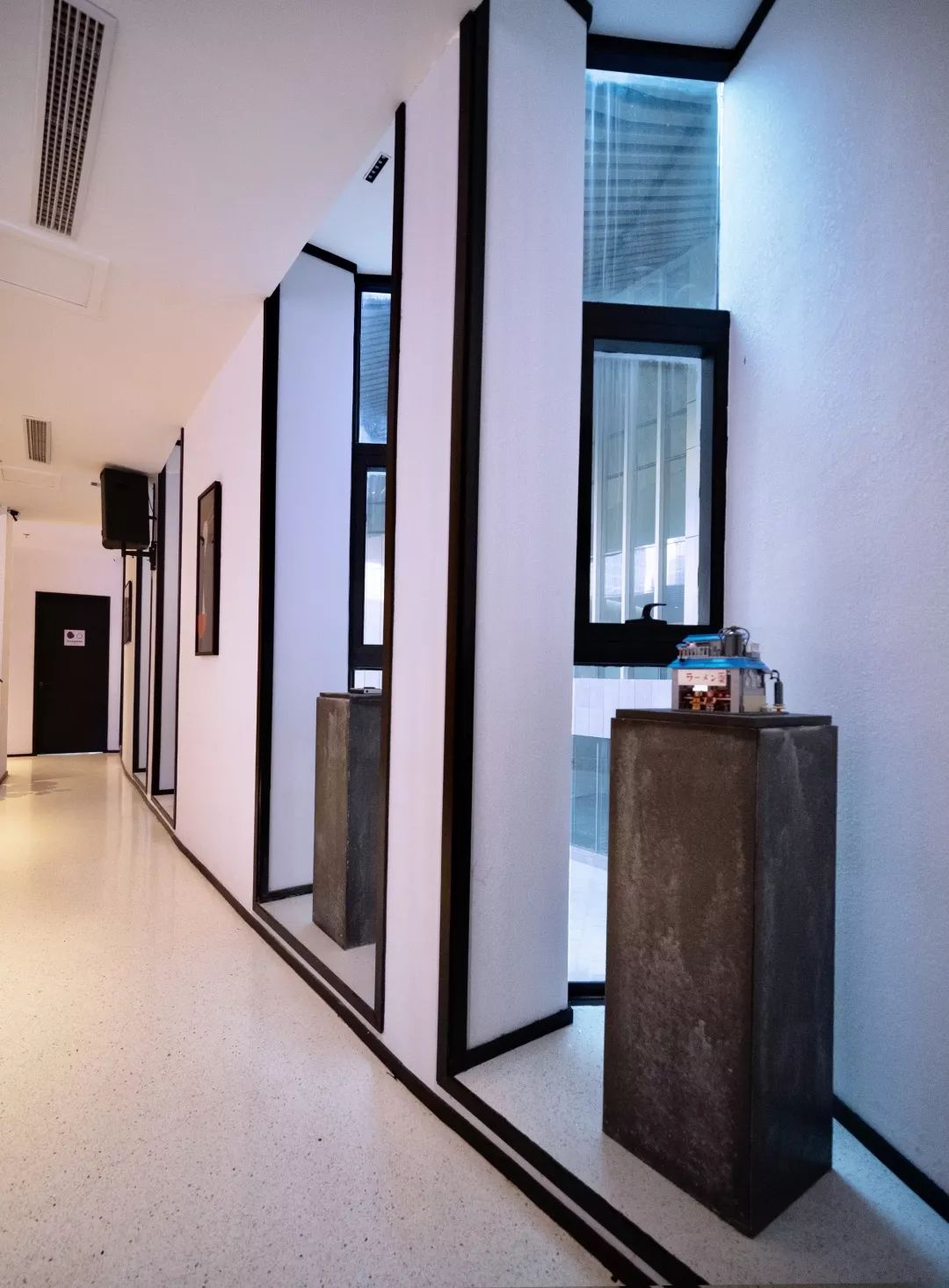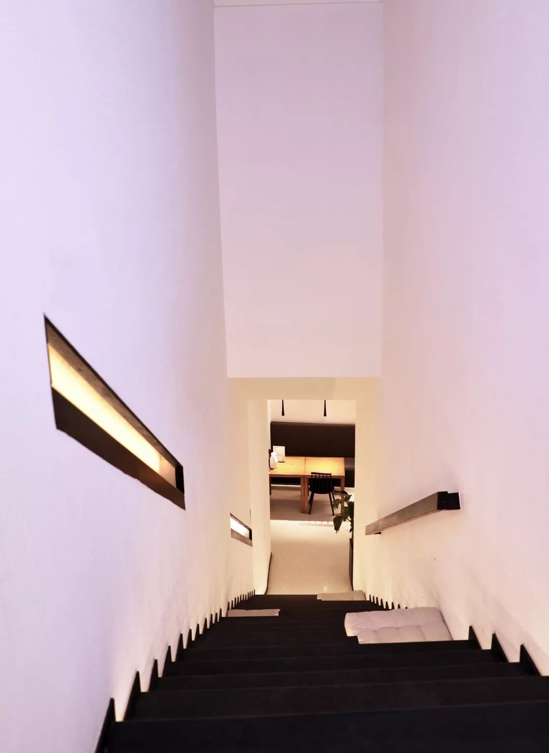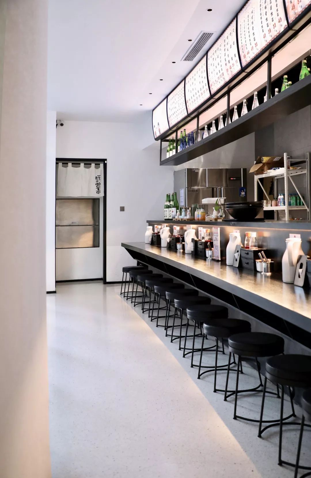 说明 本案是一个传统日式拉面店,店主年轻有想法将传统的日式拉面的味道带入中国,以快餐店形式来呈现 。整体色调以黑色白色为主,材质以水磨石,黑色胡桃木,白色艺术漆为主。灯光设计师完整的配合使整个空间更有层次,多数用的线条的手法将空间做的更简单,用些日式的软装来诠释整个空间的风格和调性。上下两层通过一个很长的楼梯进行贯穿,楼梯在中间的部分断开让长楼梯增加趣味性。
