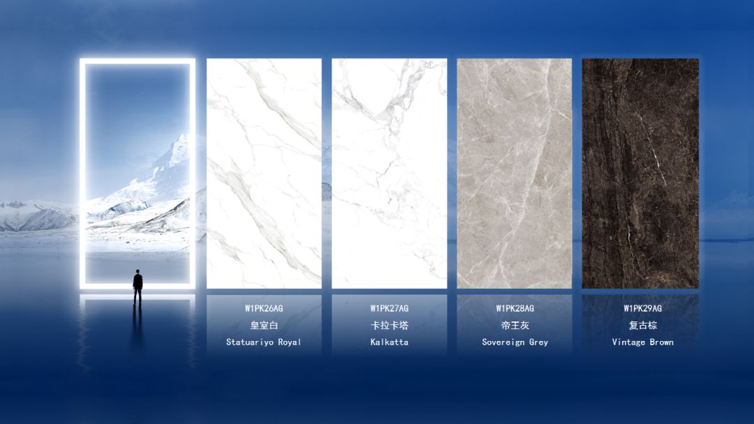 浩瀚之境系列1200x2400mm大板,设计理念以天然石材为主打,分别设计出4套纹理搭配。对纹皇室白,延展性极强的卡拉卡塔,莫兰迪色调的帝王灰,以及经典的复古棕。