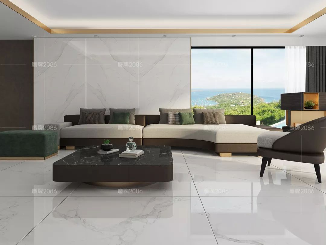 在面积足够开阔和开放的空间中,运用大规格瓷砖使空间更大气凛然,雪山白与轻奢金的完美碰撞,带来更丰富的视觉享受与更大的空间想象。