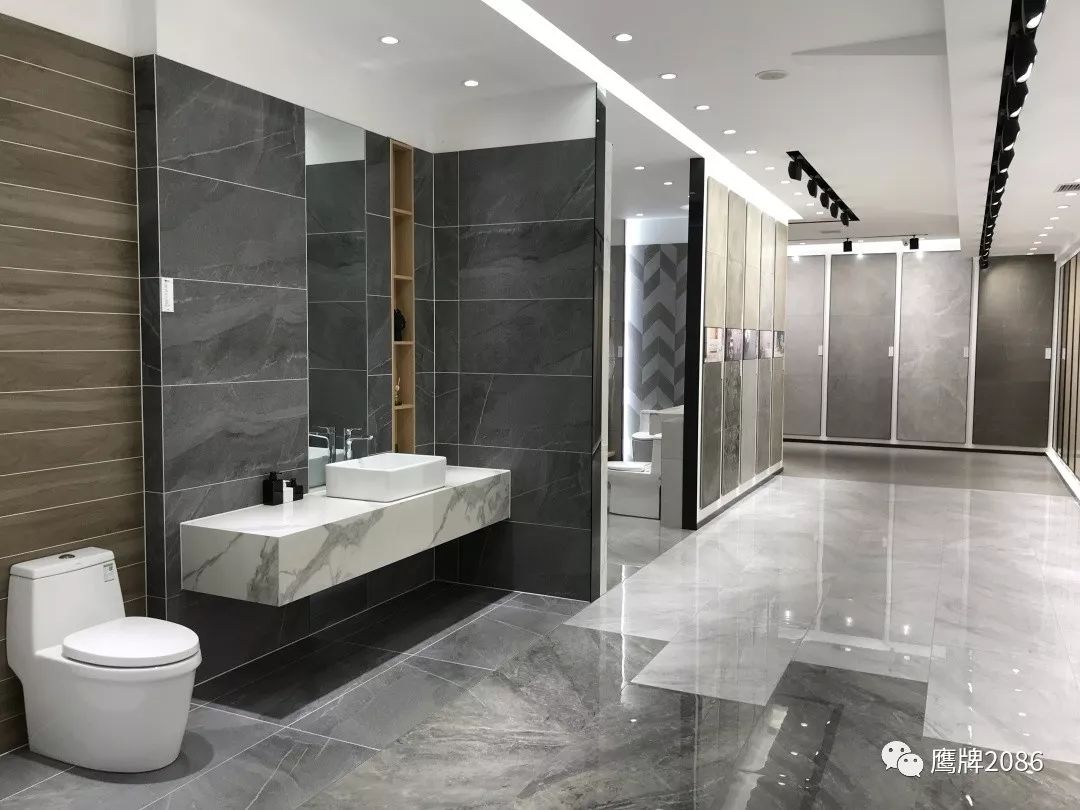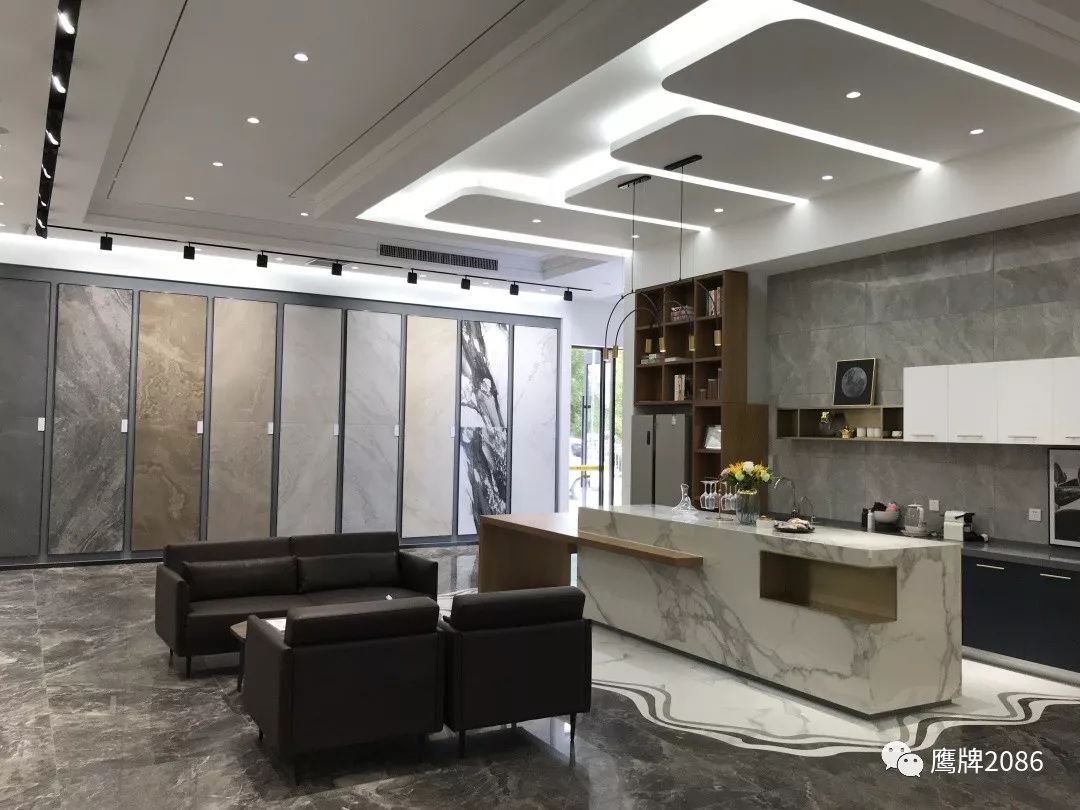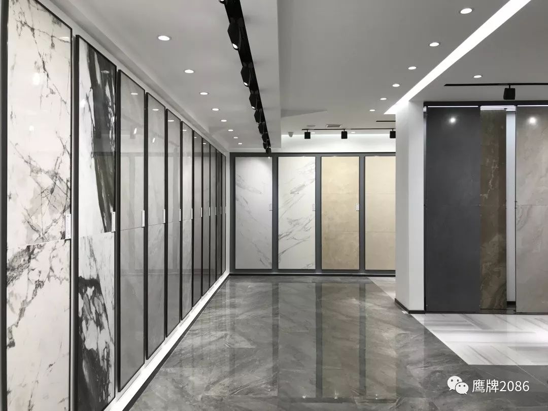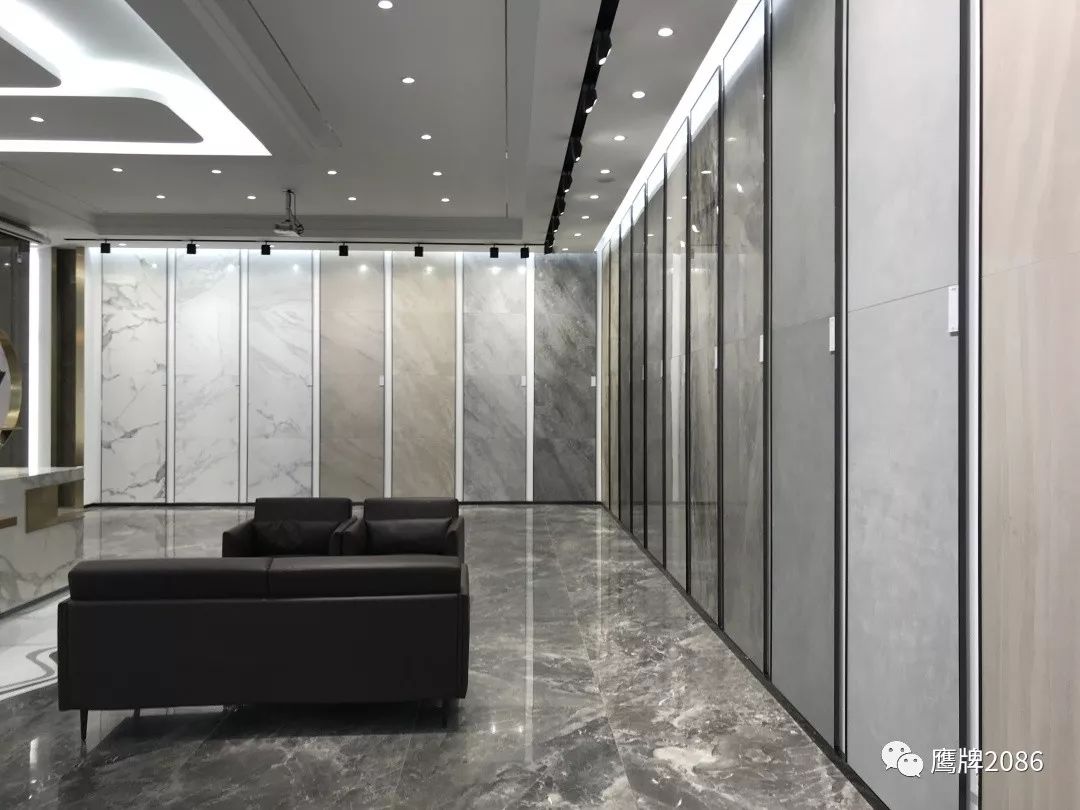 沈阳展厅共两层,总面积600㎡,一层为大板选材区和客厅样板间,二楼主要是卫浴样板间和常规规格选