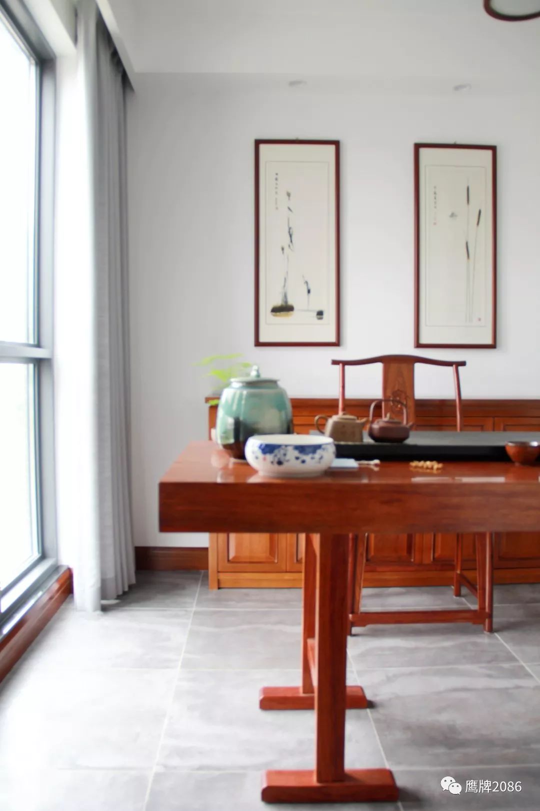 玄关、餐厅、客厅、阳台、茶室全部采用水墨京砖平铺,简约规整,与中式家具的简约对称美相辅相成,水墨质感也与茶室的清幽禅意相得益彰。
