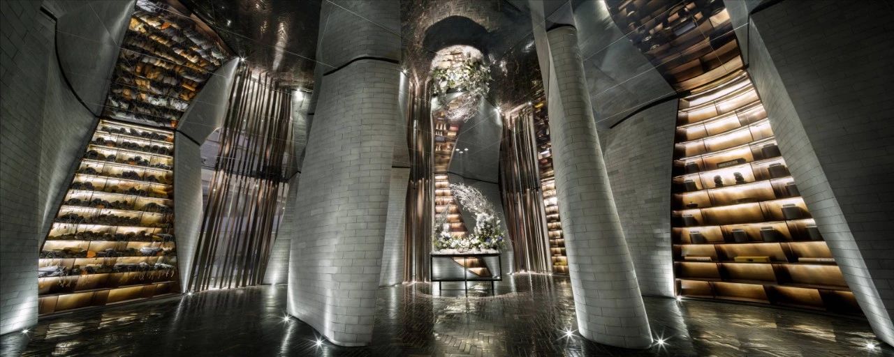 铜柱承载着琉璃羽毛,掘地而起直冲天际;在天花镜面的倒影下,仿佛穿越时光的对话。墙面的镜面又在横向维度上把空间扩大了一倍,如此让整个空间像羽翼般的梦境一样无界。我们希望客人能够感受到置身在梦境之中,扑朔迷离,形成独特的空间感受。