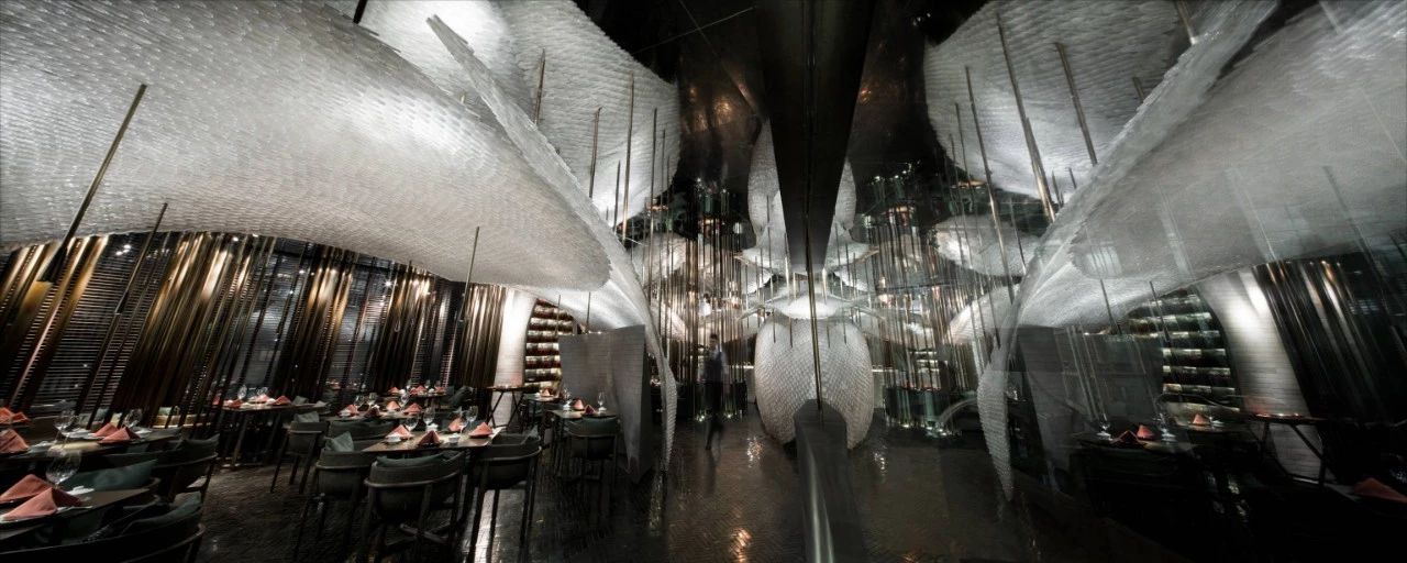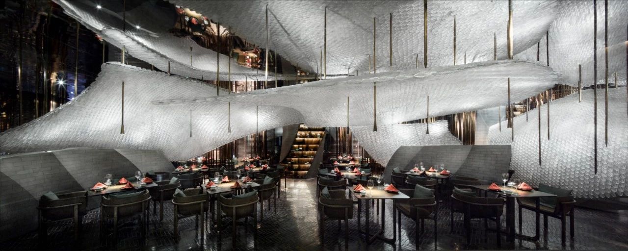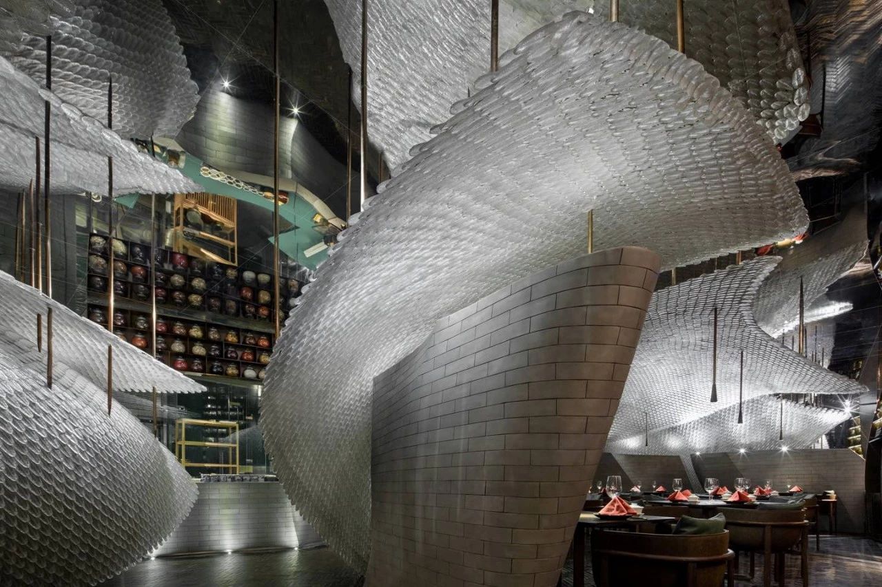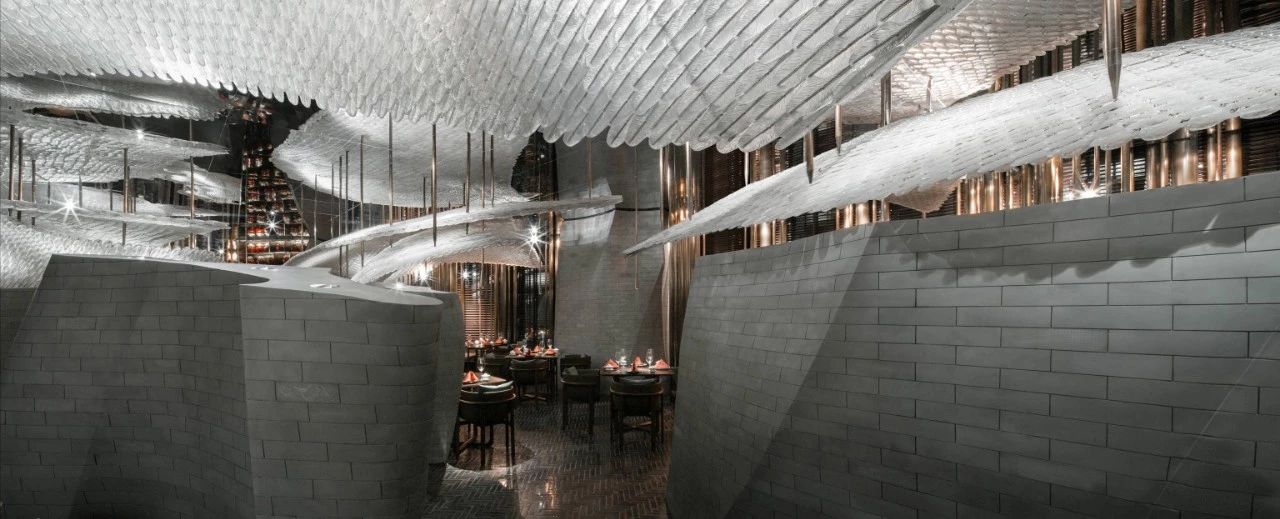 宋·川菜用现代的材料与设计手法来演绎的中式餐厅,十万块异性的不锈钢砖与四十万块琉璃羽毛构成宋餐厅的基本形态。曲面的形态打破了一贯的中式餐厅的想象,形成独特的空间感受。