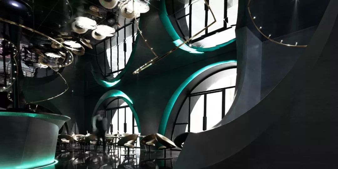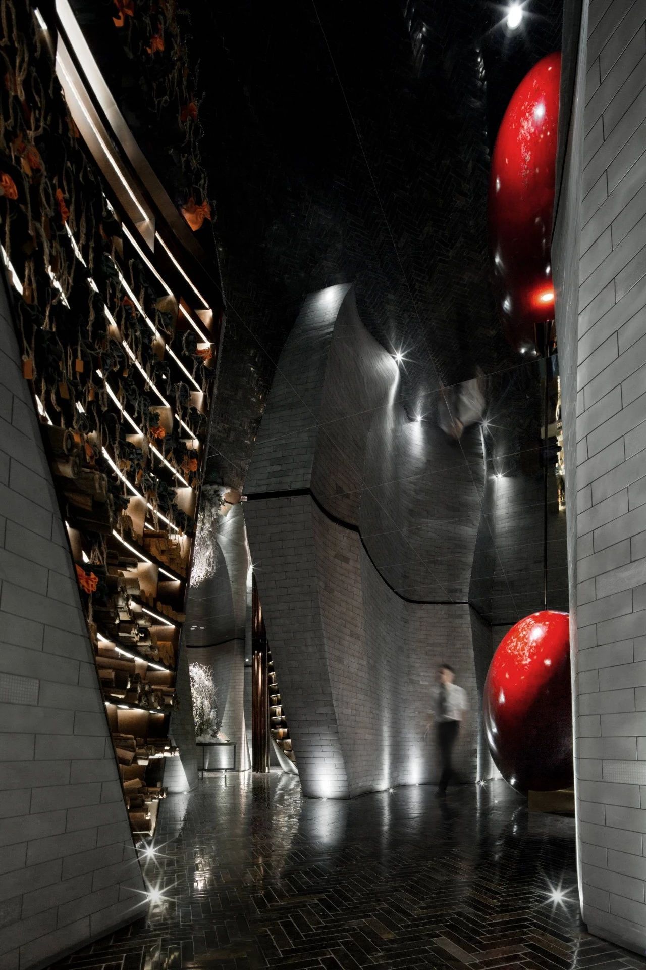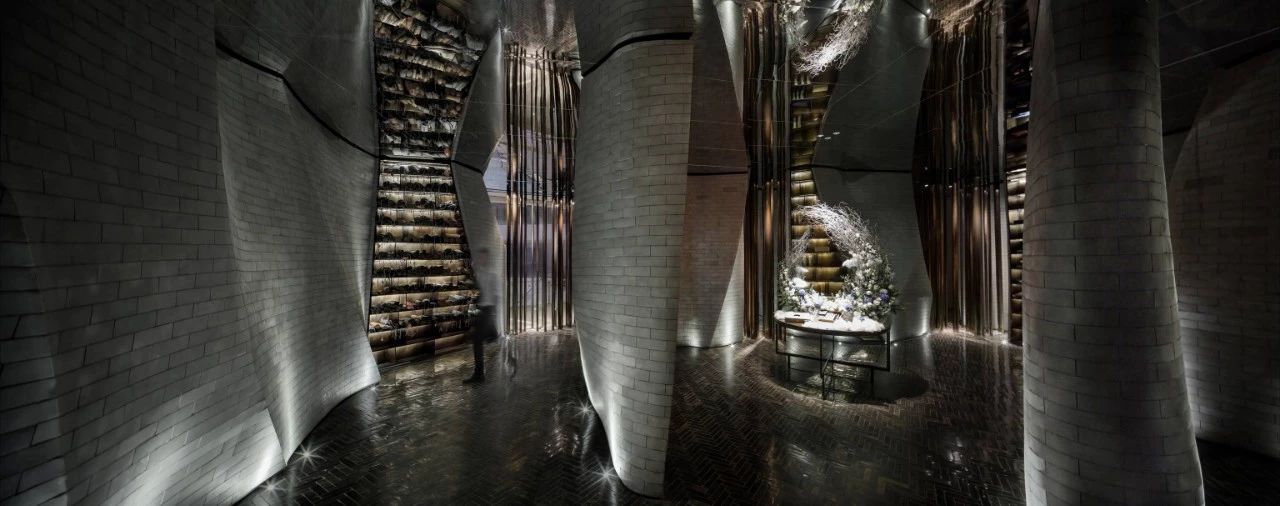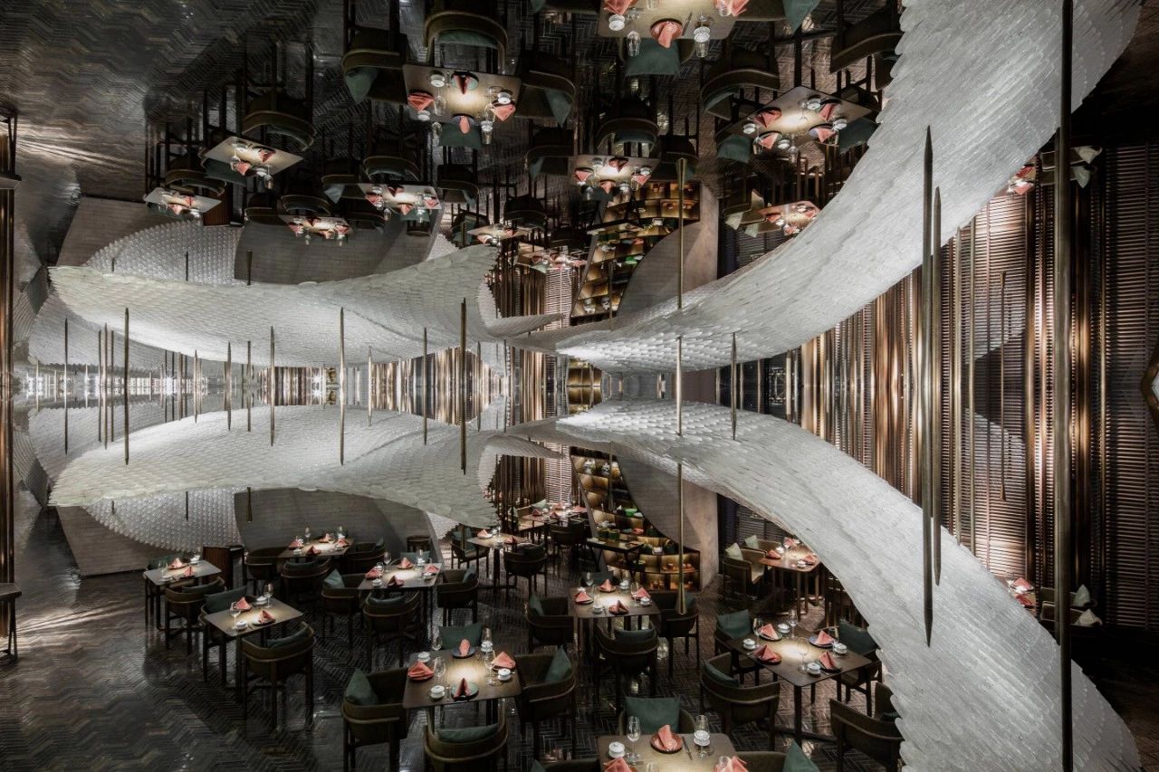 宋·川菜用现代的材料与设计手法来演绎的中式餐厅,十万块异性的不锈钢砖与四十万块琉璃羽毛构成宋餐厅的基本形态。曲面的形态打破了一贯的中式餐厅的想象,形成独特的空间感受。