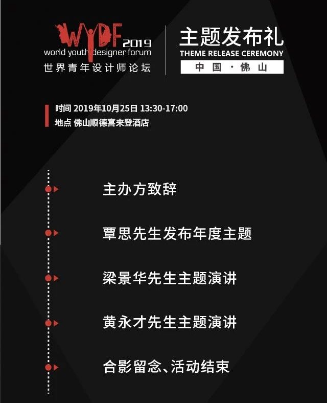 今年10月25日,WYDF将走进岭南文化历史名城——佛山,佛山是中国龙舟龙狮文化名城,素有陶艺之乡、武术之乡、粤剧之乡之称,世界青年设计师论坛【WYDF】2019主题发布礼即将在此隆重上演!