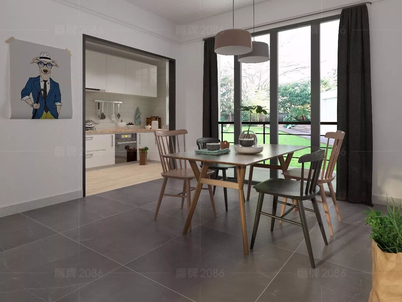 客餐厅地面运用偏深的大地色表现自然之感,线条简洁的家具与色彩明快的软饰,增添空间的灵动与欢快,卧室则用木纹砖打造温馨、亲切之感,体现轻松舒适的空间氛围。整体空间的家具多选用原木材质,原木本身所具有的柔和色彩、细密质感以及天然纹理,展现出一种朴素、清新的原始之美,代表着北欧独特的风格。