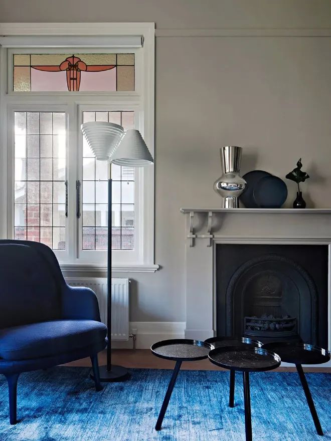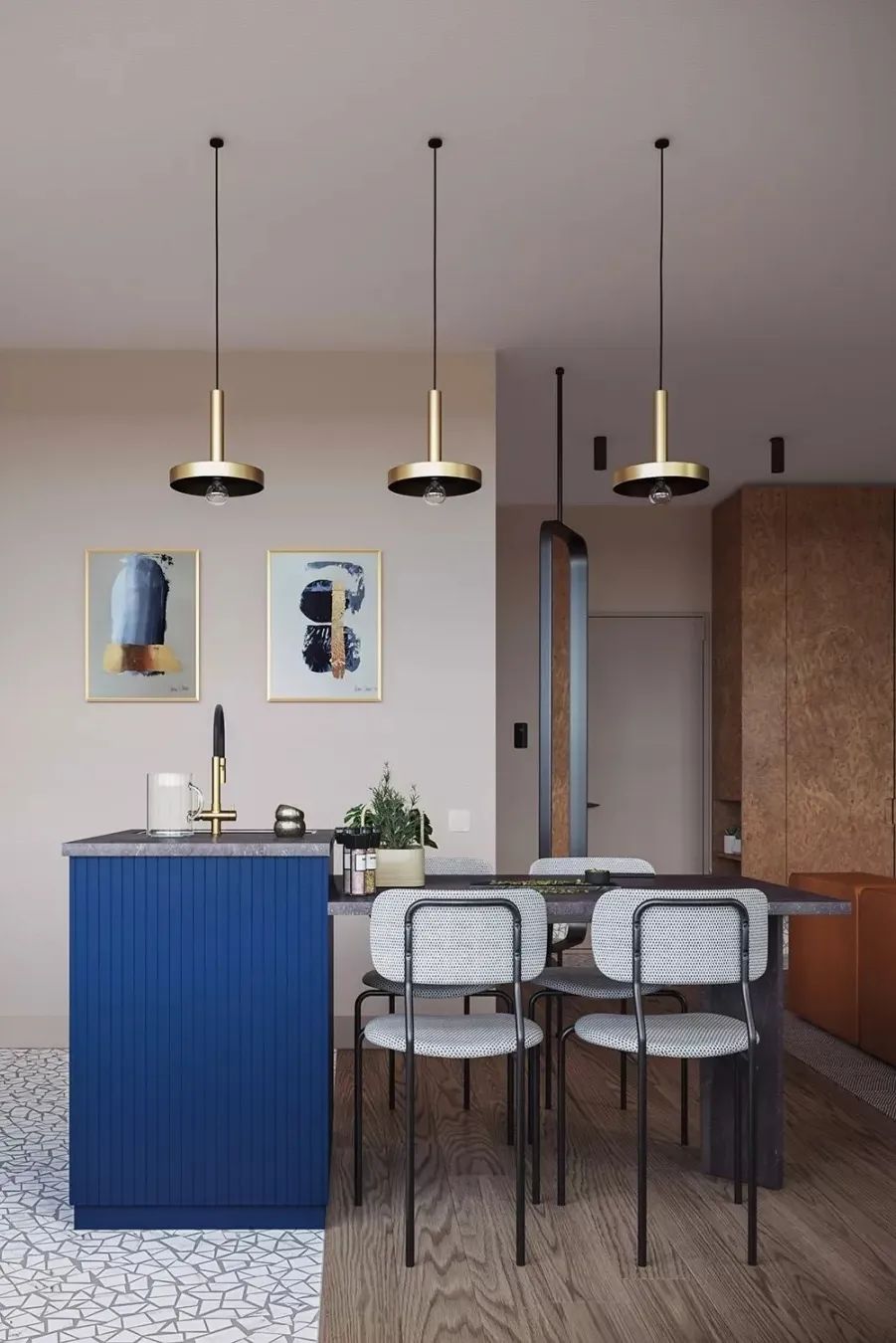 大面积的蓝,搭配明亮的白色或原木色家具,中和整体色调,同样能带给室内空间轻松的氛围,像是没有侵略性,卸下防备的互动,调动起乐观开朗的生活态度。