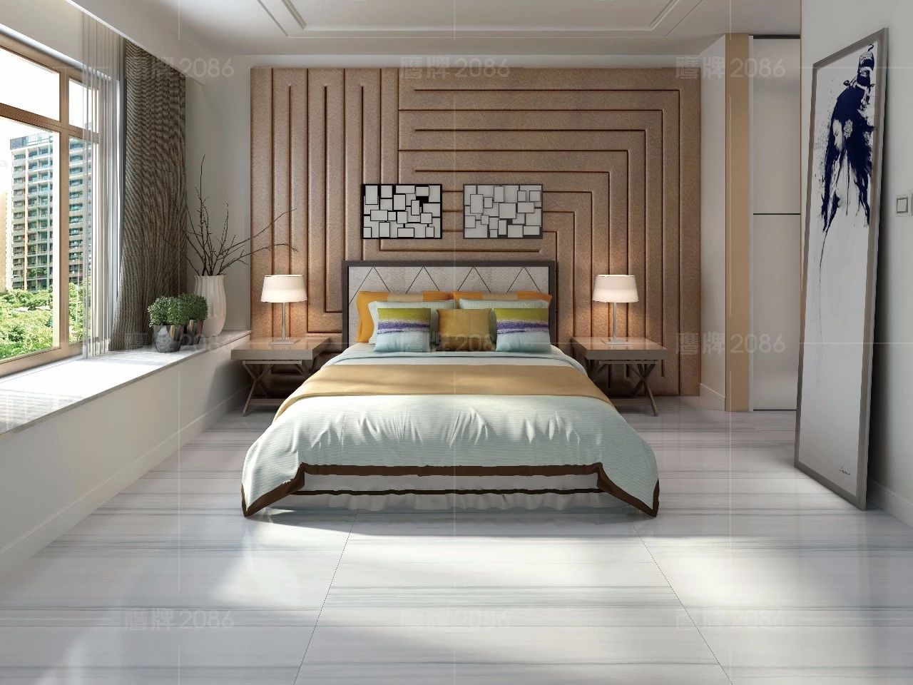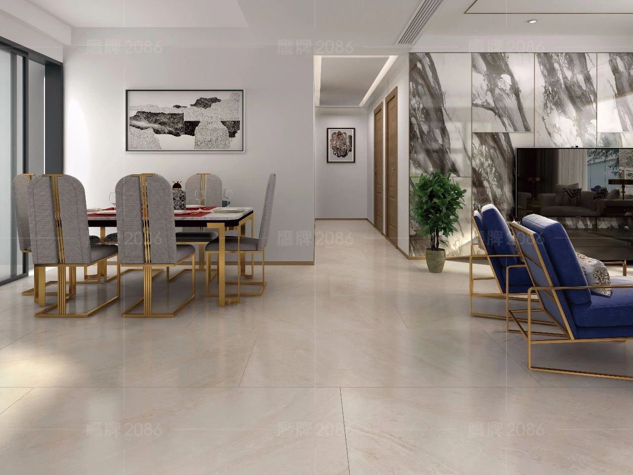 玻璃和金属是轻奢风格中最具特色的设计元素,局部点缀一些闪亮的元素更能表现奢华主义,尤其是玫瑰金的使用,使得设计更具个性化和层次感。夸张的水墨瓷砖背景墙,打破空间的单调,提高空间的视觉感和艺术观赏性。
