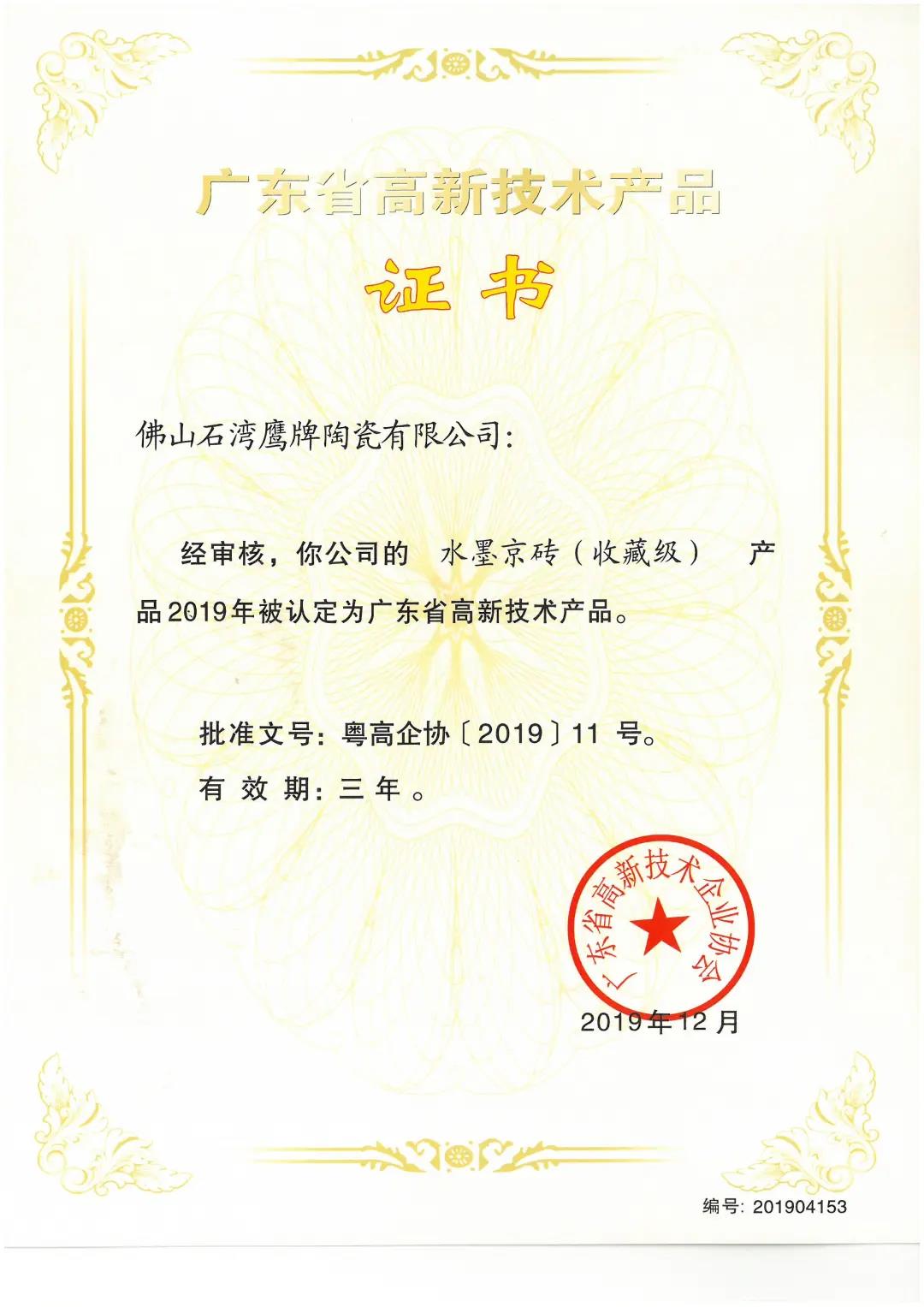经过权威性严格审核,鹰牌2086「收藏级水墨京砖」于2019年12月荣获“广东省高新技术产品”证书。