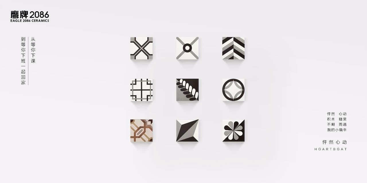 源自米兰时尚设计的 时尚范品,永不过时的自然色 素色,艺术小花砖 怦然心动,巨匠艺术水泥砖 米开朗琪罗,一种时尚态度,四种呈现风格,尽在鹰牌2086时尚范品系列