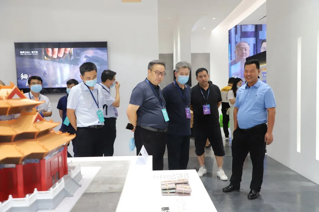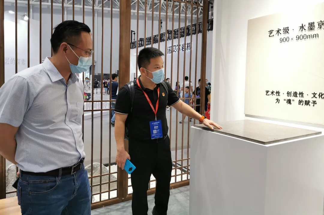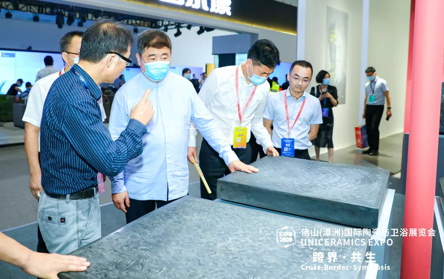 7月20日下午,景德镇陶瓷大学党委书记梅仕灿、副校长王海波等领导及校友莅临鹰牌2086展位,在鹰牌集团林伟总裁及鹰牌2086陈方根总经理的陪同下,领略古法金砖和现代“京砖”的艺术之美。