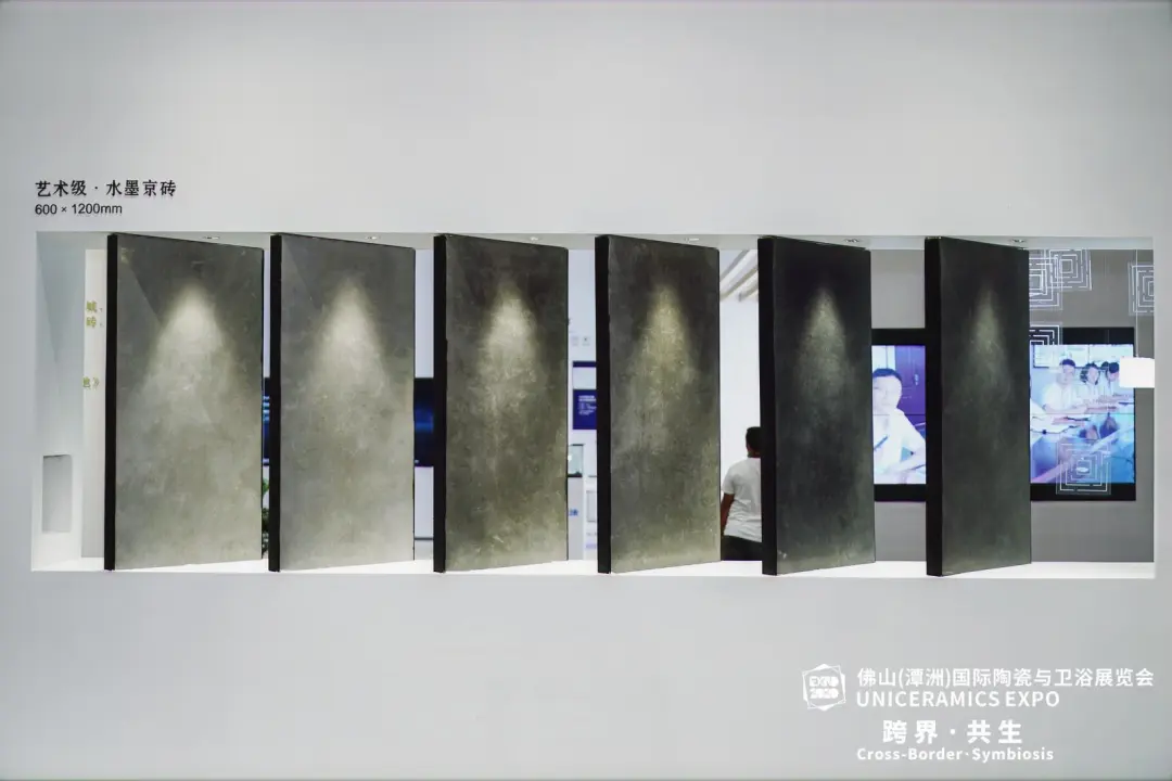 墙面展示的「水墨京砖」系列产品,呈现传统与现代的共融,从传统的御窑金砖,到现代的水墨京砖,跨越时空,对话历史,向世人述说金砖的过去、现代和未来。