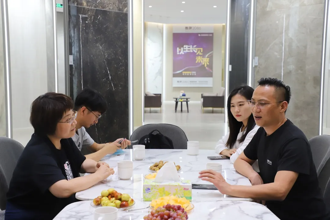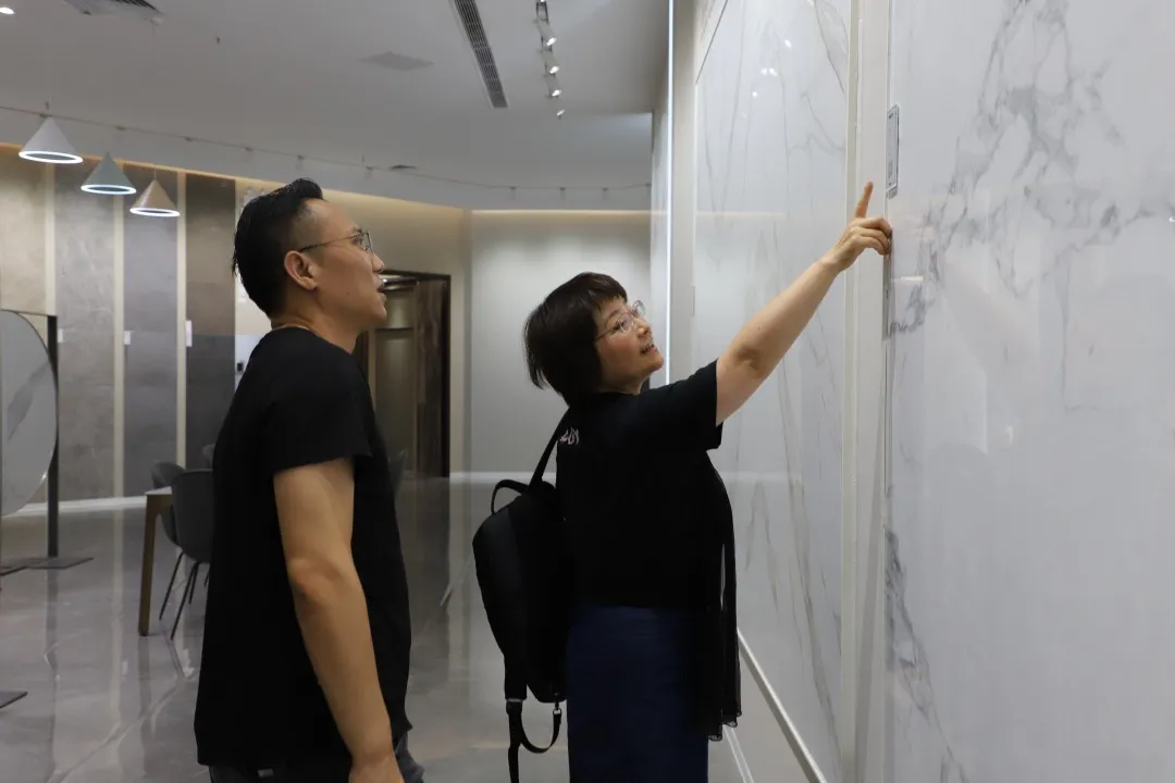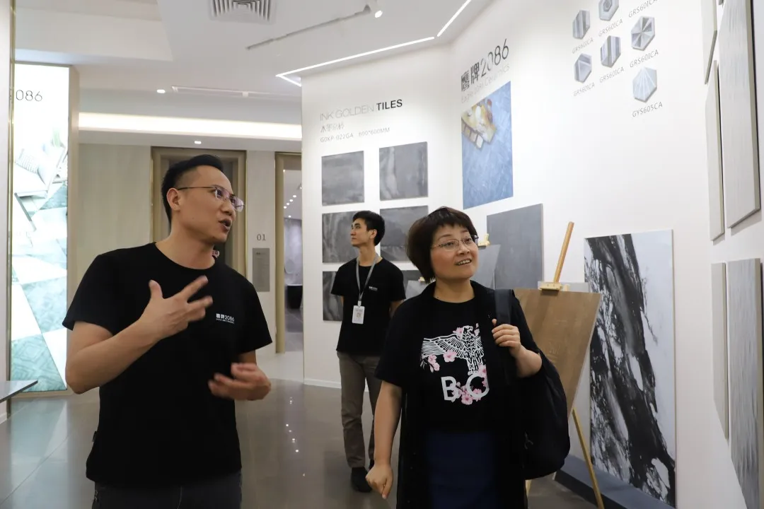 今天下午,金瑾女士带领团队莅临鹰牌2086总部展厅,在鹰牌2086营销中心总经理陈方根的陪同下,参观了展厅及众多原创建筑陶瓷产品,就金砖的历史文化和水墨京砖的研发进行交流。