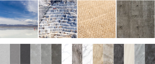 灵感源自盐湖、大理石、泼墨、布纹、水泥等多种自然元素,设计师将这些元素重组糅合,成就别具一格的建筑装饰材料。
