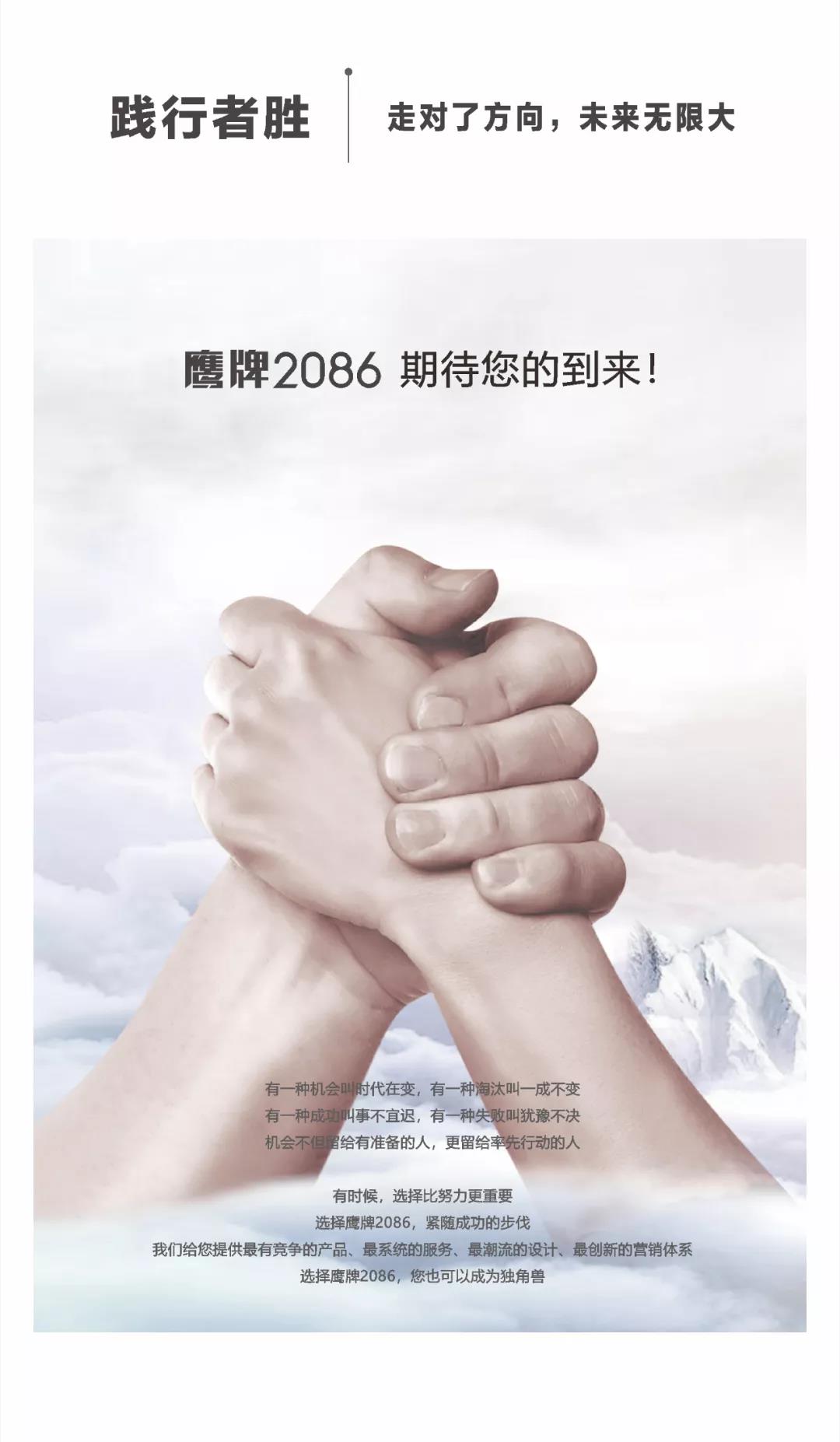 2021年,鹰牌2086再次重磅出击,开启品牌全新阶段战略布局,迎合市场需求全新推出区域中心仓运营模式,助力终端快速下沉市场,帮助经销商灵活经营,“轻”松盈利。