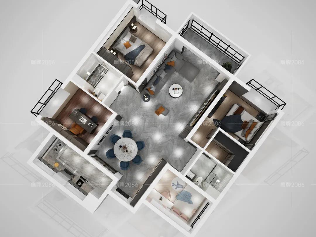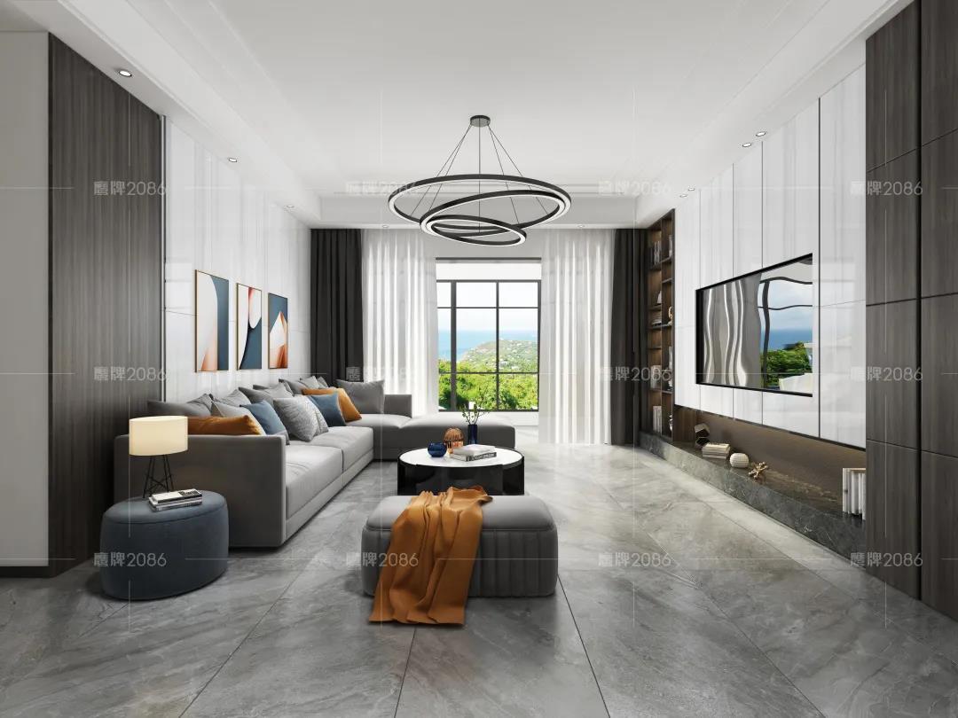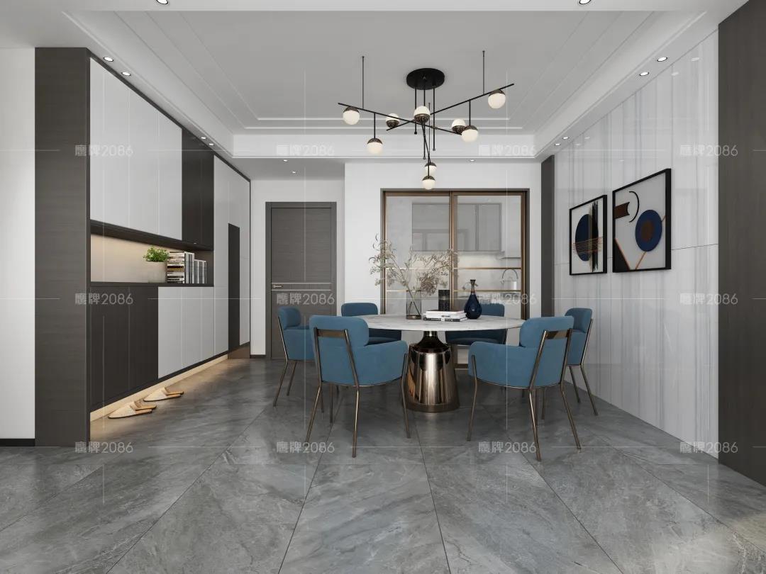 灰色系大理石瓷砖通铺,从客厅延伸到餐厅,打破了空间的局限性,在和谐氛围中共处。蓝色与橙色在空间中相得益彰,暖调里的雅致,冷调里的静谧,时尚与理性并存。