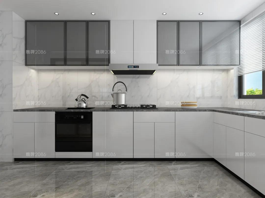 以白色为主体打造的厨房更显明亮,地面运用灰色系瓷砖,空间看起来有层次感。L型的操作台为主人带来了一个方便实用的做饭空间,右边窗户有自然光透入让整个空间视觉效果更好。