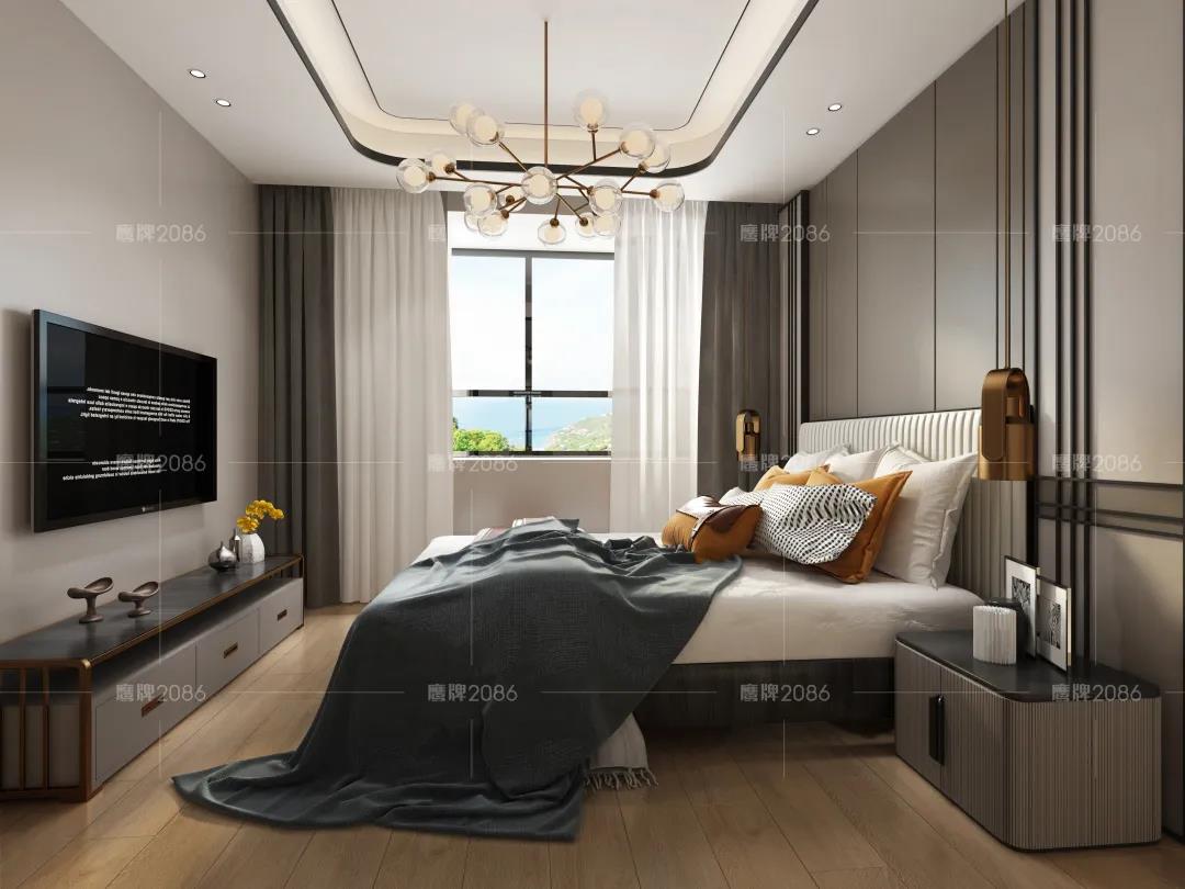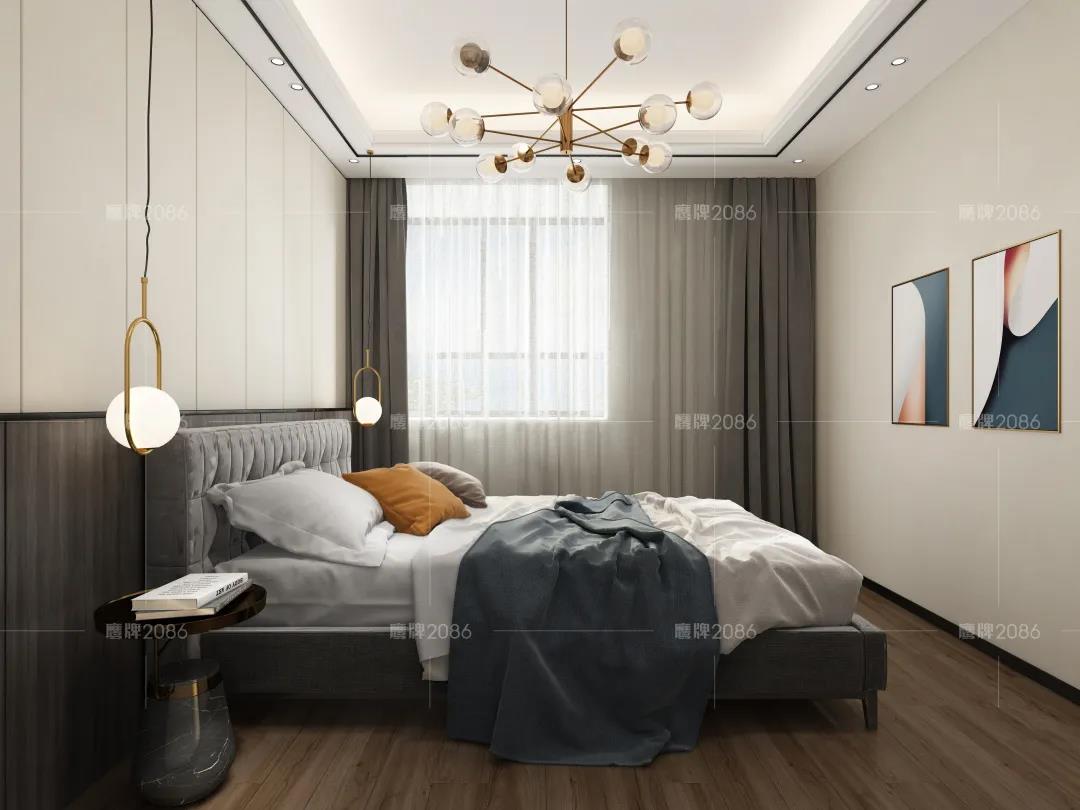 卧室空间整体硬装素净简洁,橙色与金属色软装搭配在整体氛围中跳跃出来,为空间增添了些许奢华感,细节处充满精致。