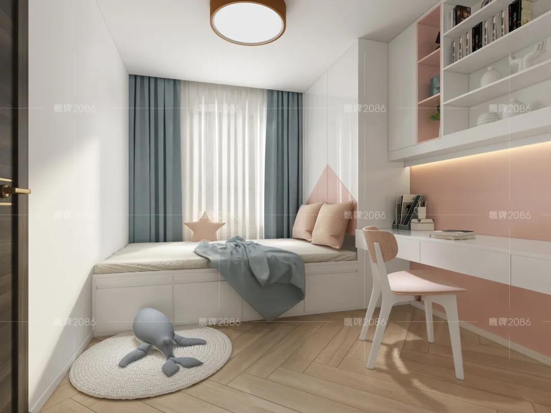 儿童房的设计采用了低饱和度的粉蓝和粉红色,搭配浅色木纹砖,为小朋友营造了一个温和柔软的休息与阅读空间。