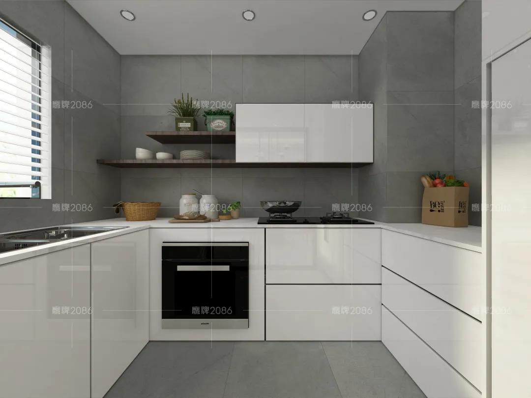 灰白色调搭配让人百看而不腻,装上百叶窗,隐隐约约带给人清新明亮的视觉体验,绿色的盆栽植物点缀在厨房中,带来自然别致的生活气息。