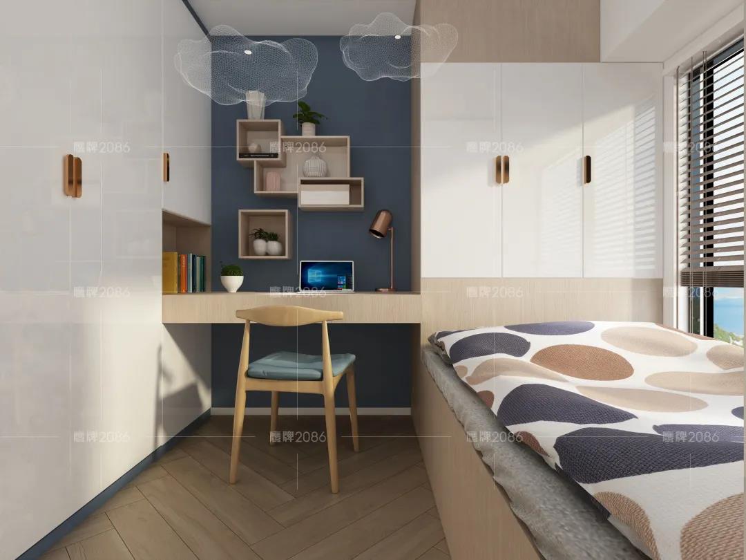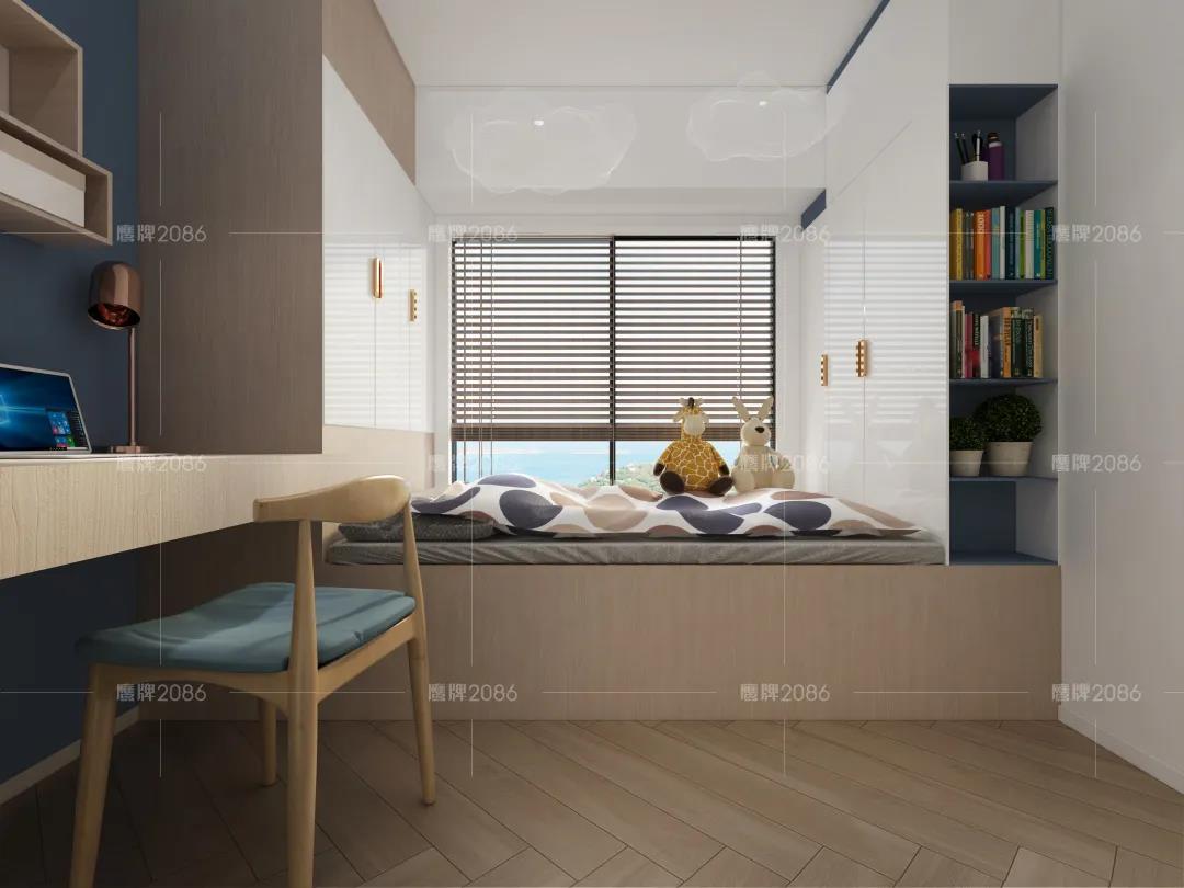 儿童房采用白色与原木色搭配出自然亲肤的氛围感,陶瓷一线品牌鹰牌2086浅色木纹砖使用人形铺贴,打破空间的规整和秩序,点缀了一点灵感有趣,为小朋友营造了一个温和静谧的趣味空间。