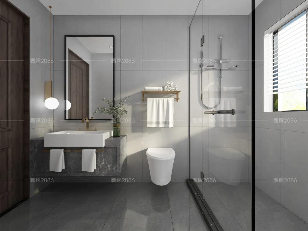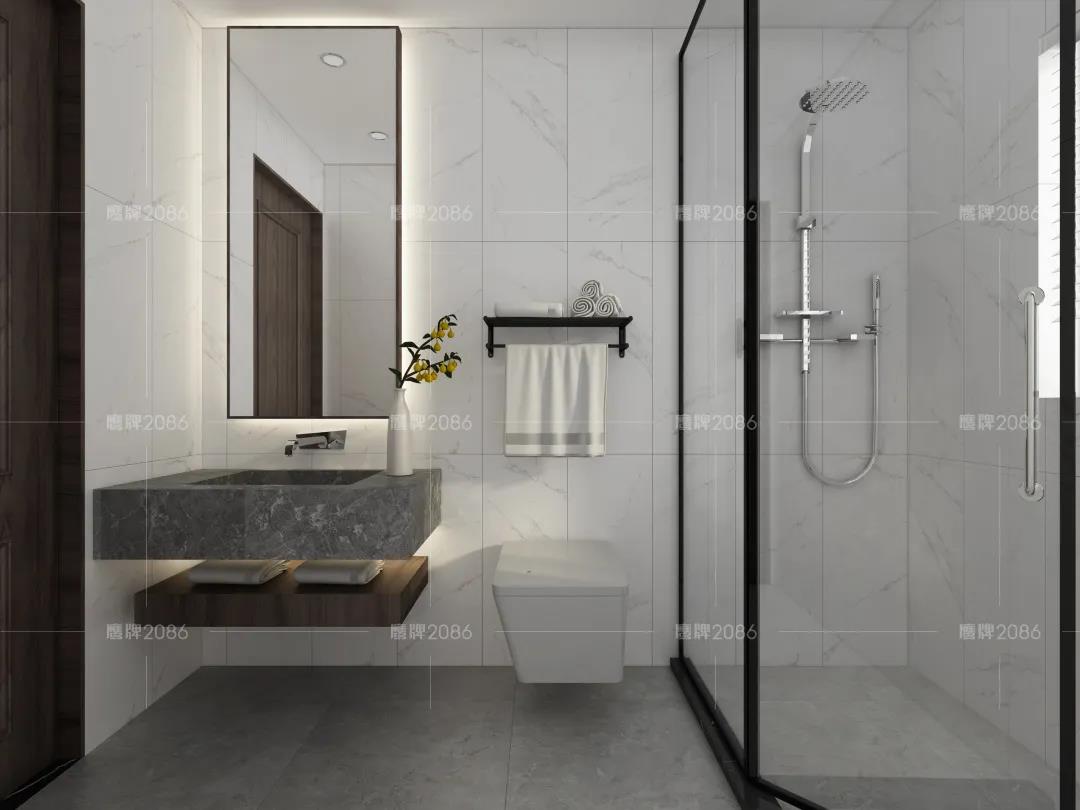 双卫浴空间采用合理的干湿分离设计,采用陶瓷十大品牌鹰牌2086灰白色系300×800mm缪斯系列上墙,让小小的卫浴空间更明亮更富有活力。壁挂式的设计也使得空间看起来更轻盈,使用起来更方便。