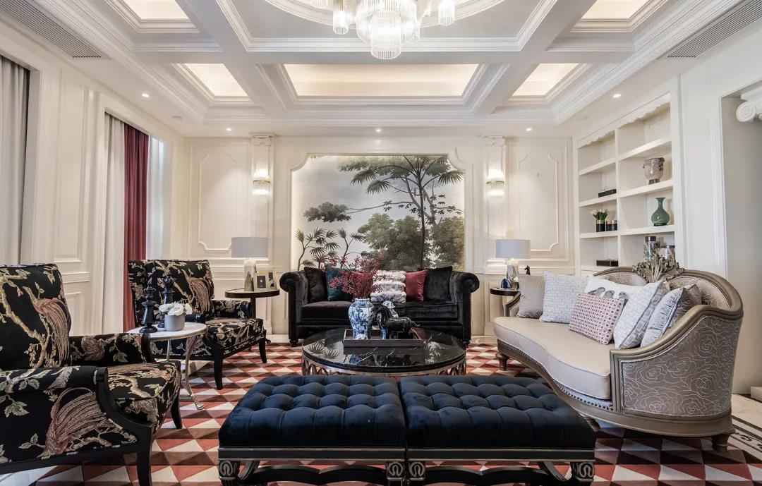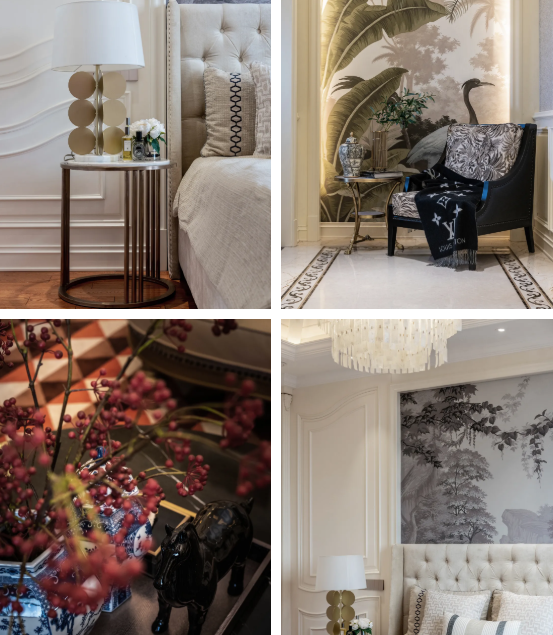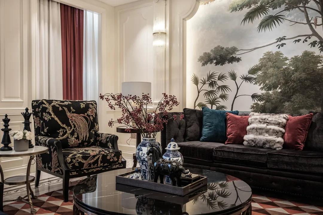 洛可可式纤细黄铜桌脚的圆几上,放着黑色皮质的线装书。法式鎏金瓷罐,勾着青蓝线条与图案,是思想者的岛屿。一侧墙上,有黑白色曲颈的鹤端立,那里有茂林,层次色调深远。墙的近处伸出宽大的芭蕉,青黄色亮着明暖。那把有着中式明椅构式的现代轻奢制的沙发椅黑色沉稳,椅面上包着塔希堤岛上热带灌木与宽叶树的图案,那是画家高更画作里的“大溪地”,里面藏着南太平洋上柔绵的风。