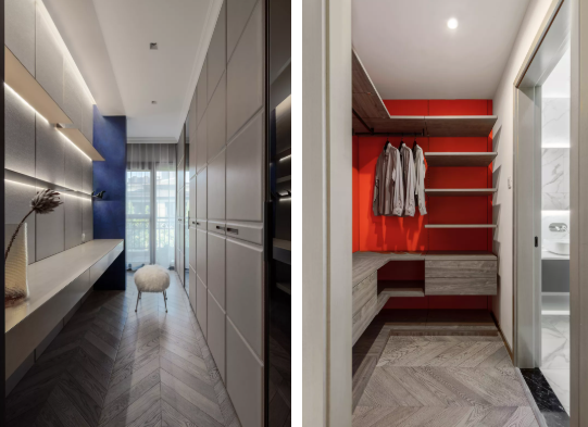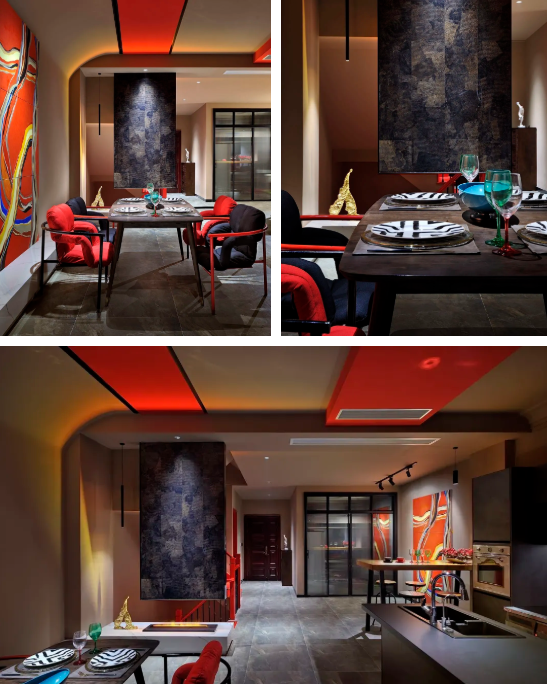 红色空间带来的那种暖意,是整体性的亮点。在原有的色系中,增加了杏色,有助于空间的提升感。