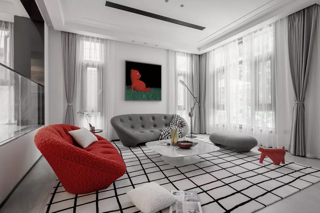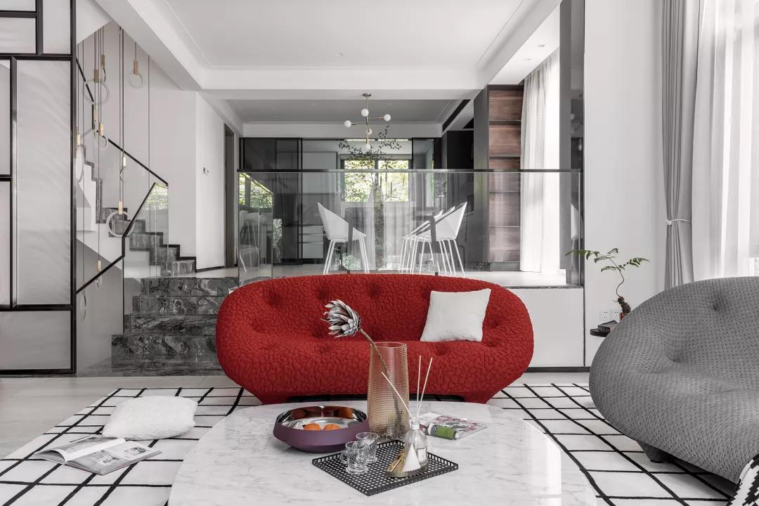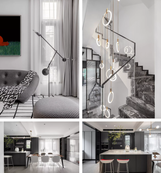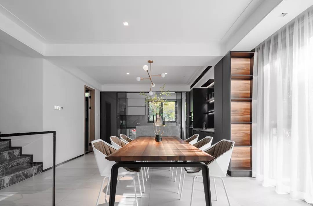 这座位于成都双流的独栋别墅,共两层,面积为340平方米。一楼大厅是7米高的 挑空空间,7米高的墙面上,一正一侧各辟出五米高的大窗户,最大尺度地将室内 与室外融合为一体。