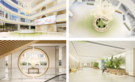 门诊大堂运用中国传统“借景”的设计手法,在乘坐手扶梯的时候,透过造型屏风中间的圆形,可以看到大堂的“白玉兰”吊灯,深度诠释禅医“上善若水,智慧仁心”的精神理念,让医疗机构也可以是一个轻松快乐、让人忘却[疾病]与[不幸]的交流平台,以人性化的设计概念,提升医务人员的幸福感和消除就医人员的恐惧感。