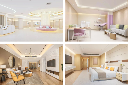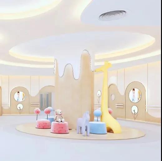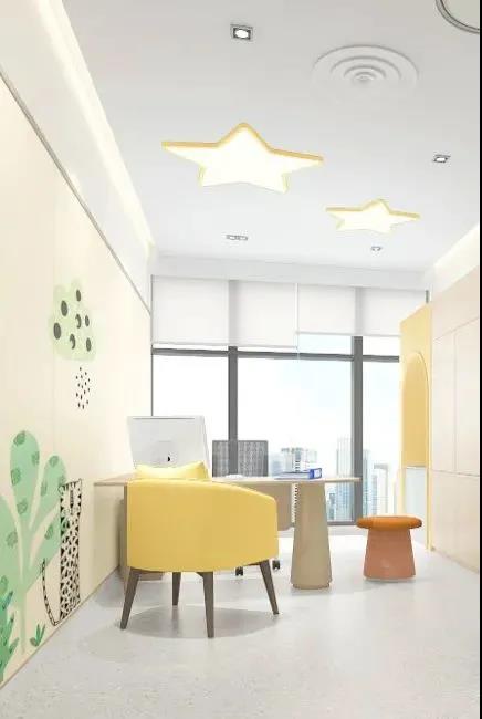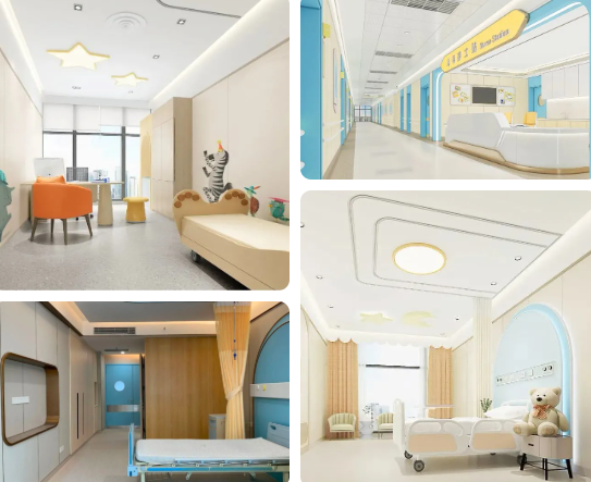 颜色搭配清新,整体温和的颜色可安抚儿童的心情、削弱儿童对医院空间的恐惧感,将儿童带入一个梦幻的童话世界,带小孩看病再不是件难事,为患儿建立一个安全温馨、愉悦舒适的医疗和康复环境。