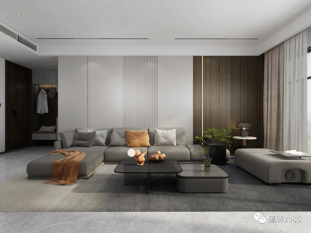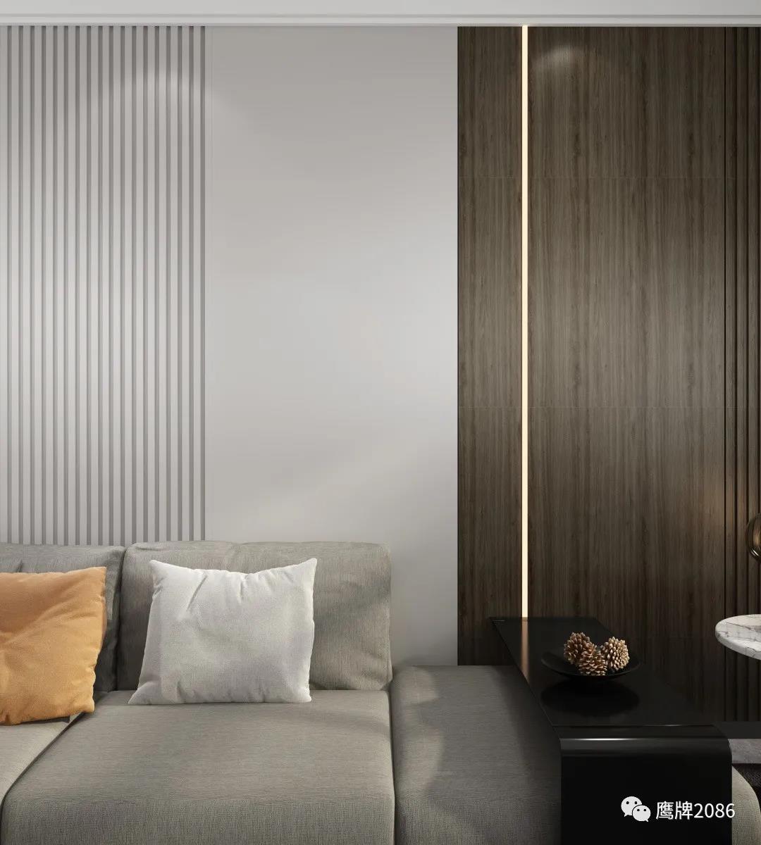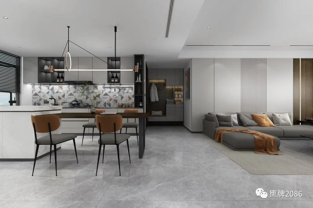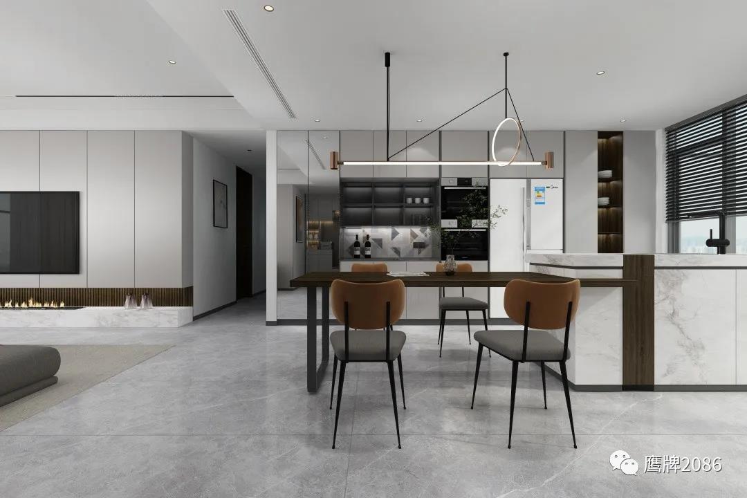 本案全屋设计从健康美居出发,除了选用鹰牌2086现代砖之外,还应用了鹰牌2086墙地专家新上市的产品——板装配式护墙板和石晶地板,打破单一材料售卖的局限性,实现整装高定快速交付,为消费者提供所见即所得的一站式家装设计服务。