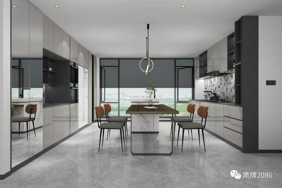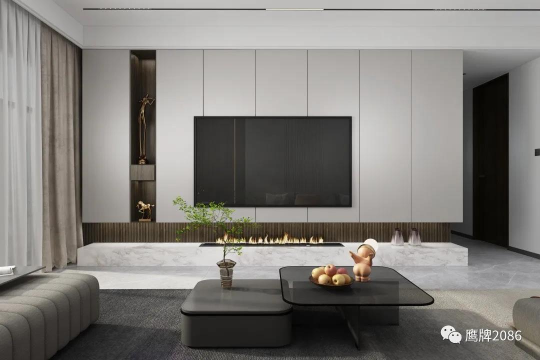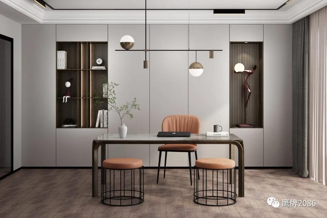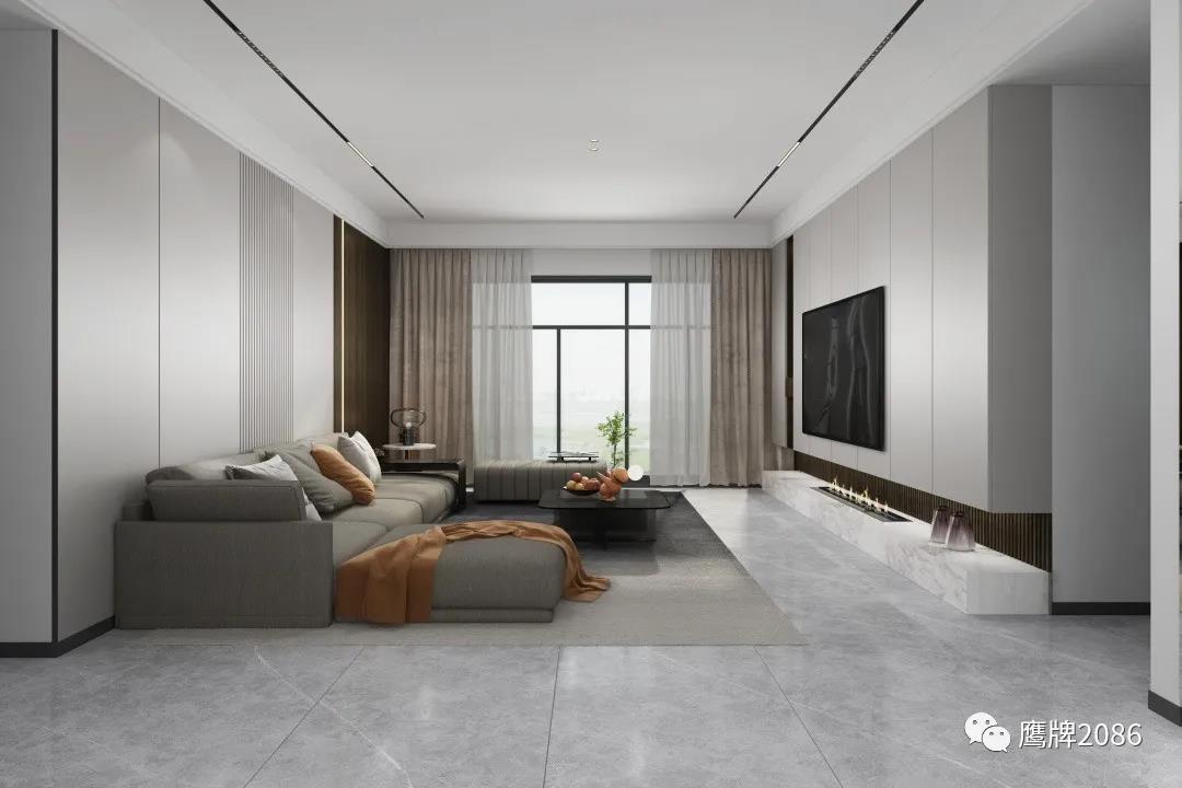 本案全屋设计从健康美居出发,除了选用鹰牌2086现代砖之外,还应用了鹰牌2086墙地专家新上市的产品——板装配式护墙板和石晶地板,打破单一材料售卖的局限性,实现整装高定快速交付,为消费者提供所见即所得的一站式家装设计服务。