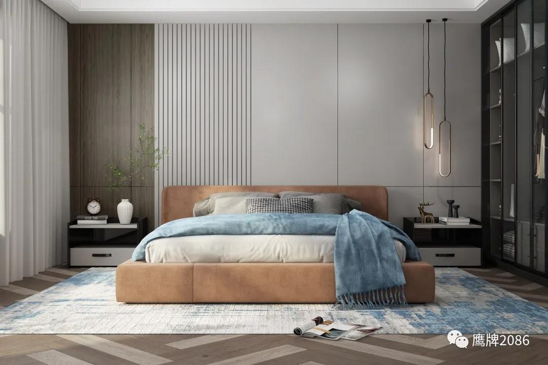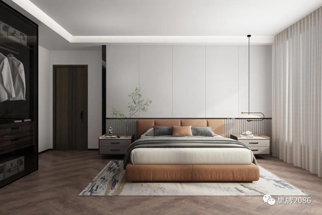 细心的网友可能会发现,主卧背景墙跟沙发背景墙的视觉效果很和谐一致。没错,这就是使用鹰牌2086装配式护墙板的好处,不仅能实现门、墙、柜立面同色,且能够确保整体效果的连贯协调,全屋整装交付,呈现出有设计感的高端家居空间。
