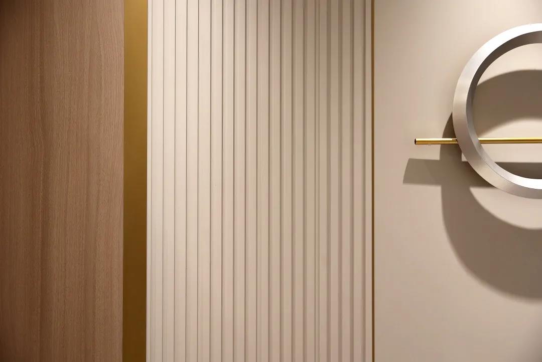 由硅藻泥科技板+环保PUR热熔胶+环保EBPP饰面材料组合而成。其中饰面包括肤感、皮纹、木纹、金属高光等系列,墙板可灵活定制成直面、圆弧形面、甚至凹凸面。按照标准化程序施工,可实现轻便快装、杜绝甲醛/TVOC的释放,防污易洁、抗菌抗敏、防水防潮、抗弯耐用。
