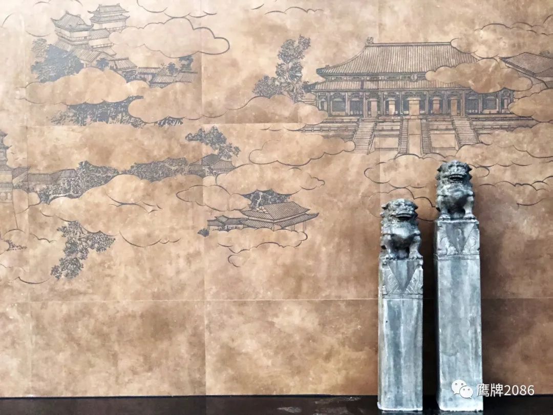 水墨京砖和意象青花系列,作为品牌IP产品,传承东方文化,设计师用现代手法呈现文化新生,打造古典茶室样板间和独立选材区,以红墙月亮窗作为隔断,尽显东方美学韵味。