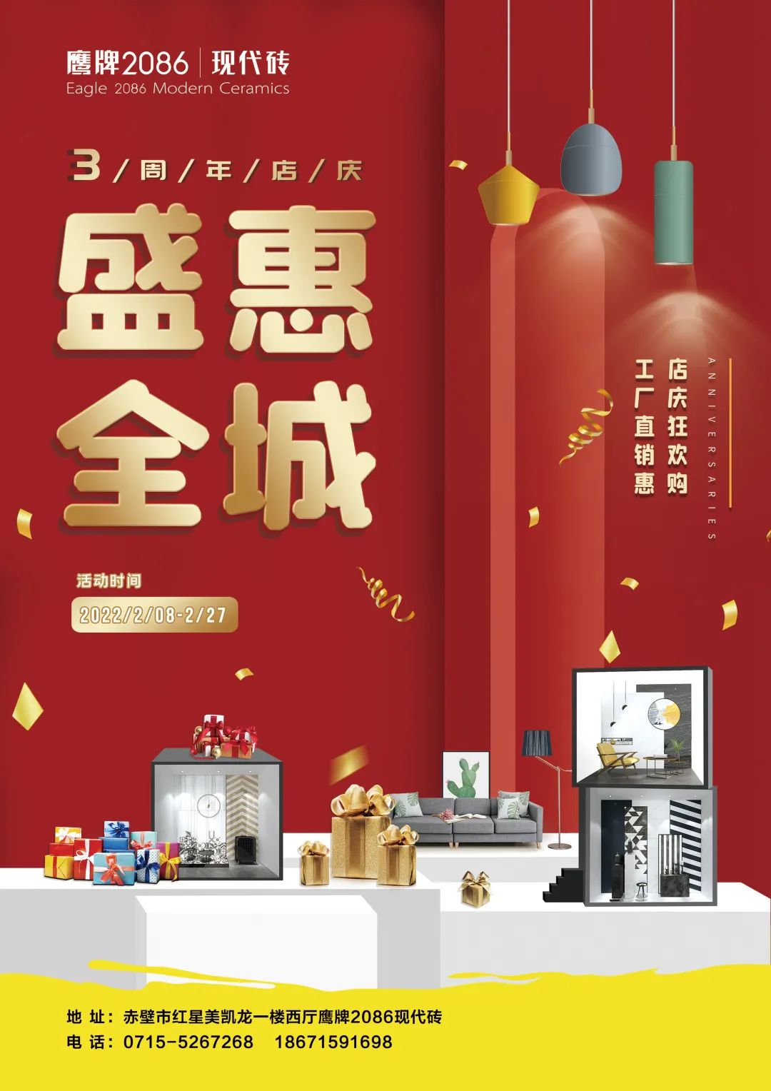 2月8日至27日,瓷砖十大品牌鹰牌2086赤壁旗舰店三周年店庆盛惠全城,气氛满满的展厅布置迎来了开年第一战,为当地消费者带来美好生活解决方案和最吸引的选购福利!