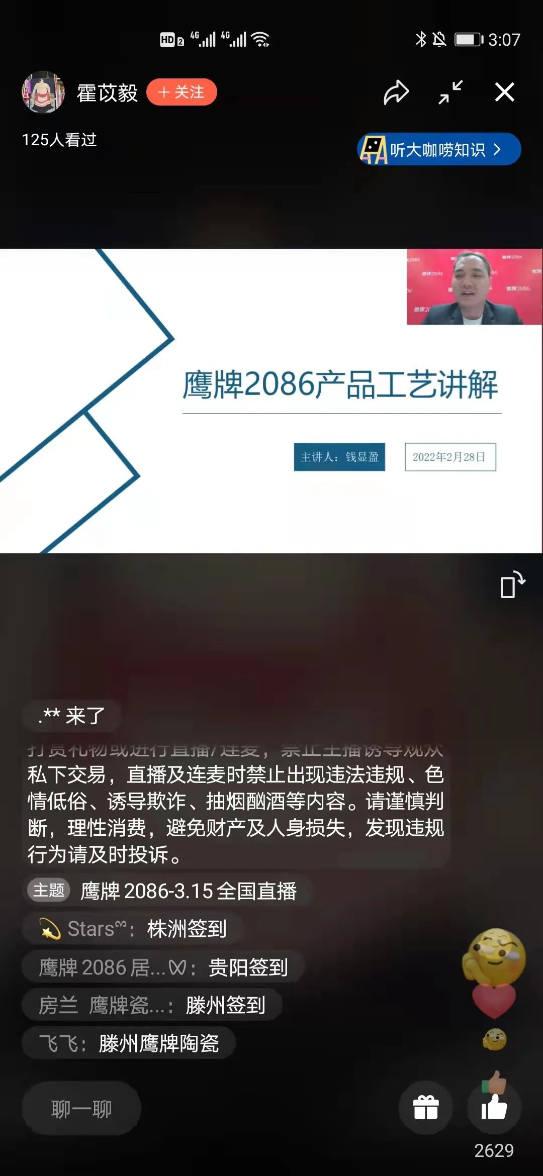 为了打好这场战役,更快更好地协助终端经销商恢复销售状态,首先由鹰牌2086产品部进行瓷砖工艺直播讲解,助力终端人员更好的销售瓷砖。