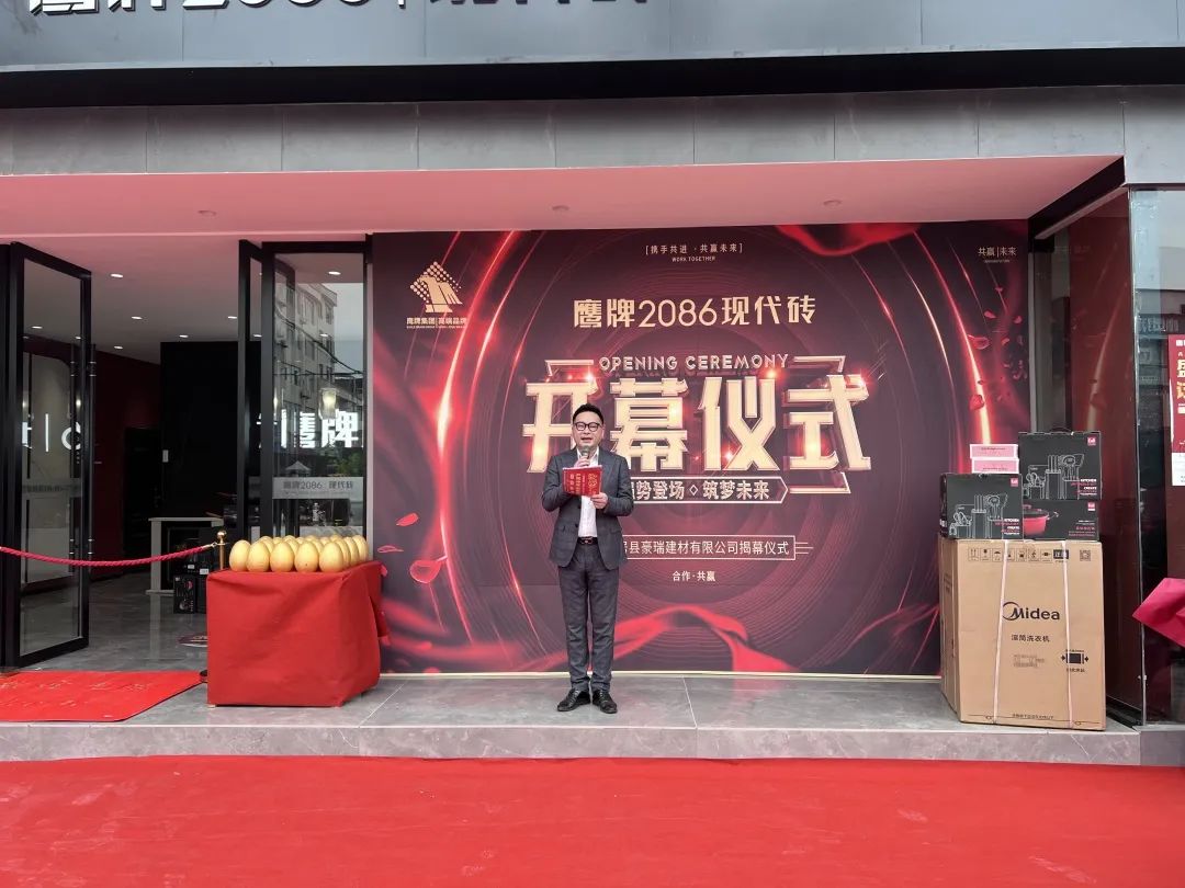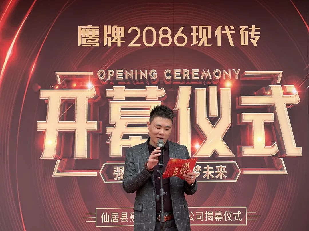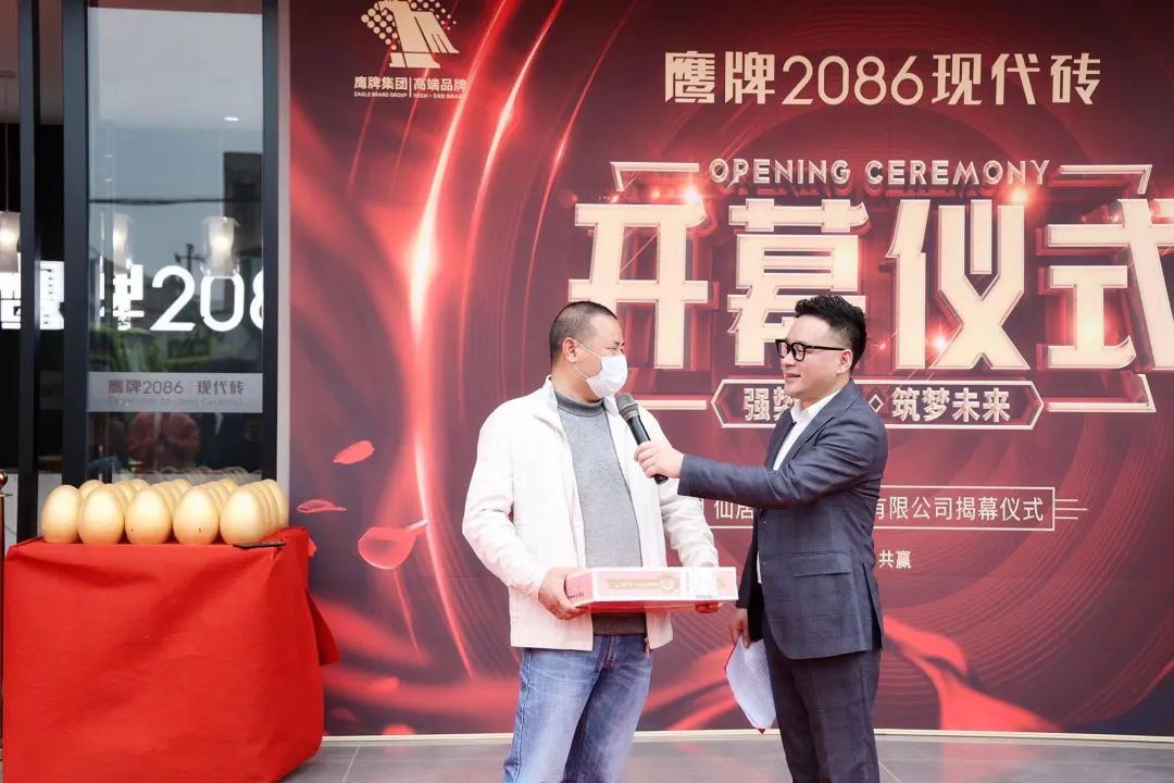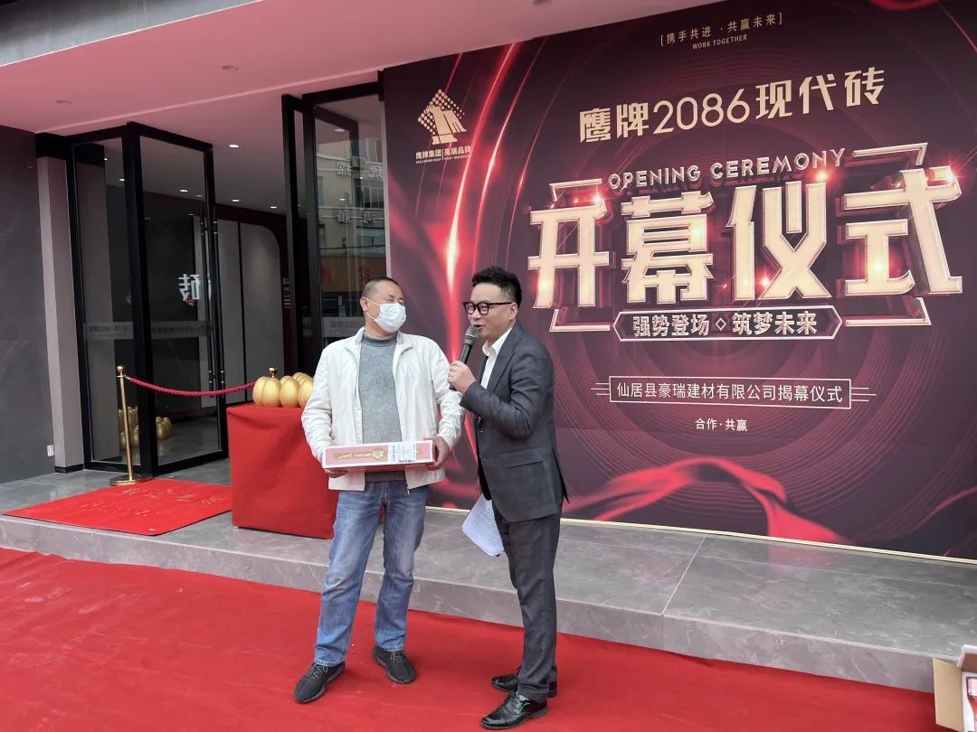 在现场观众的共同见证下,仙居县豪瑞建材有限公司、鹰牌2086仙居旗舰店董事长徐均伟先生和佛山鹰牌2086浙江销售总监陈太荣先生为开业盛典揭幕,共同对鹰牌2086仙居旗舰店祝以美好期盼。