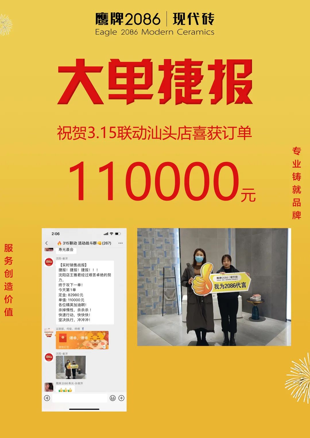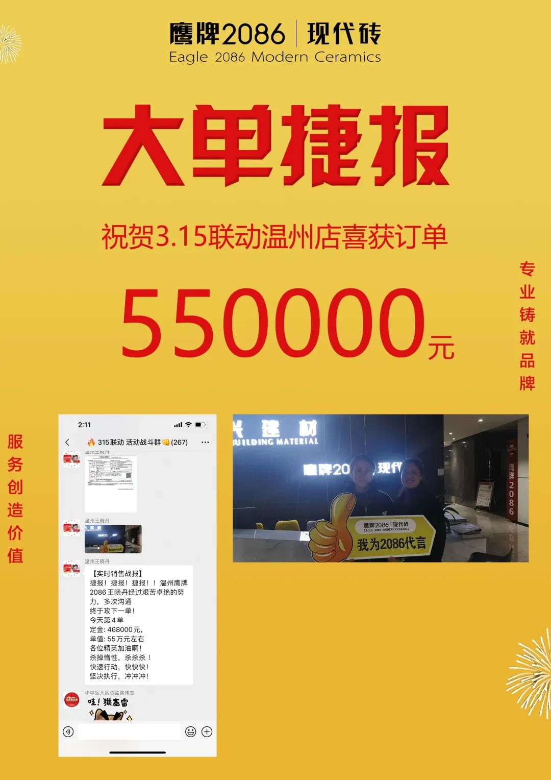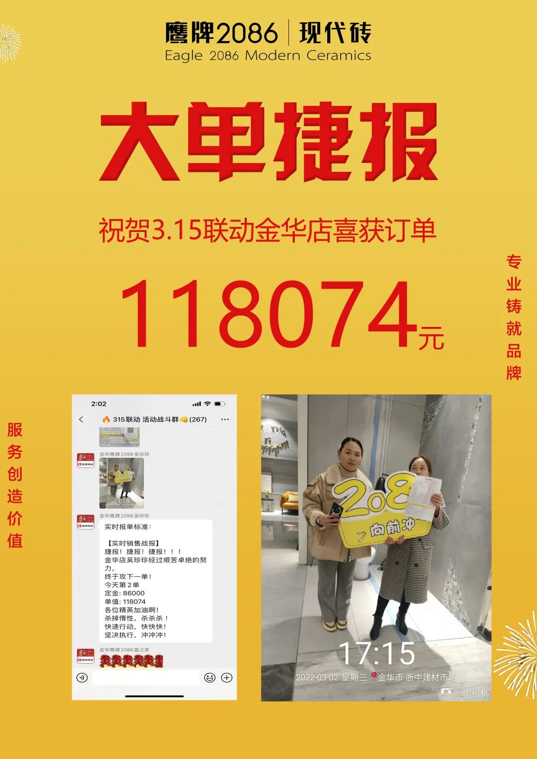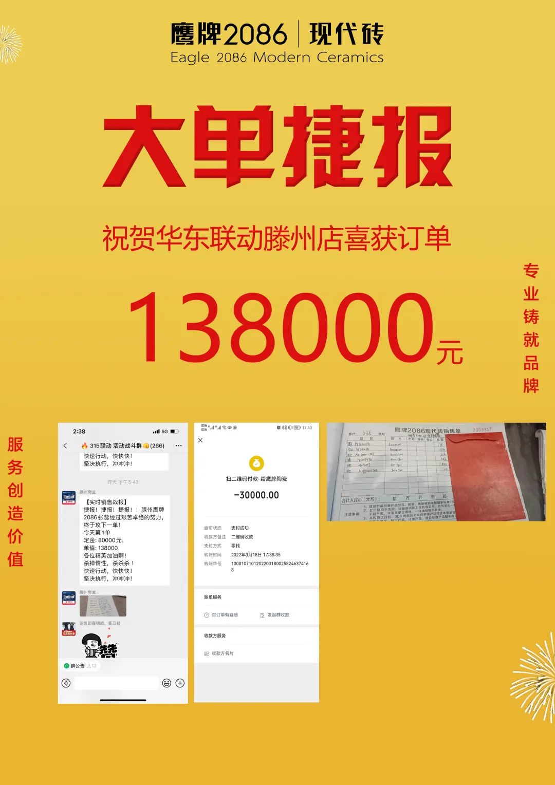 3月1日-20日,由鹰牌2086总部运营部策划的“315品质装新家”全国联动活动圆满收官。在此前315联动启动会上,经过运营部精心策划的线上直播讲解启动,全国门店的家人们都已达成共识,统一目标,一致行动,经过热血奋战,创造了订单额1117.4万的非凡成绩。2022首战告捷,赢得开门红!