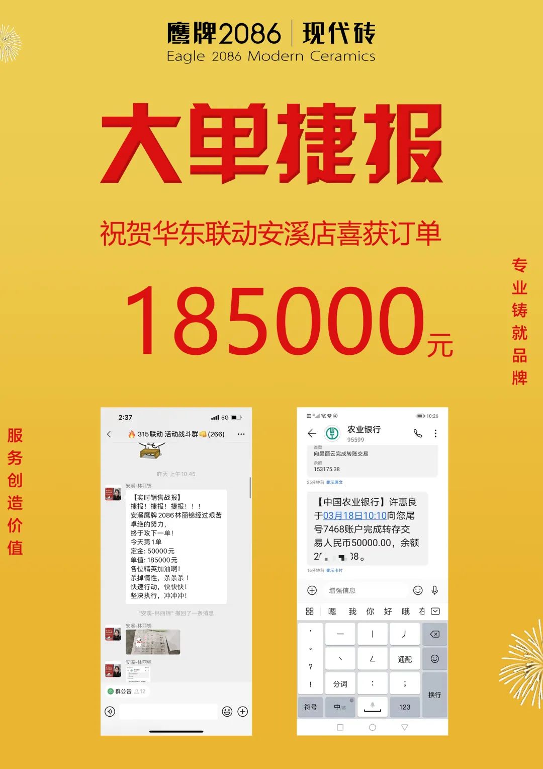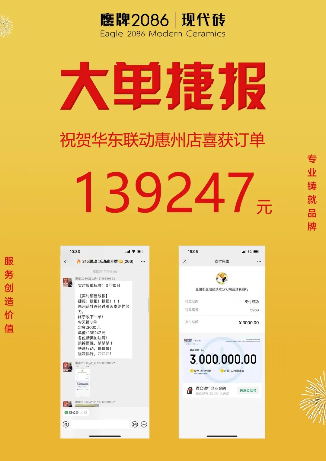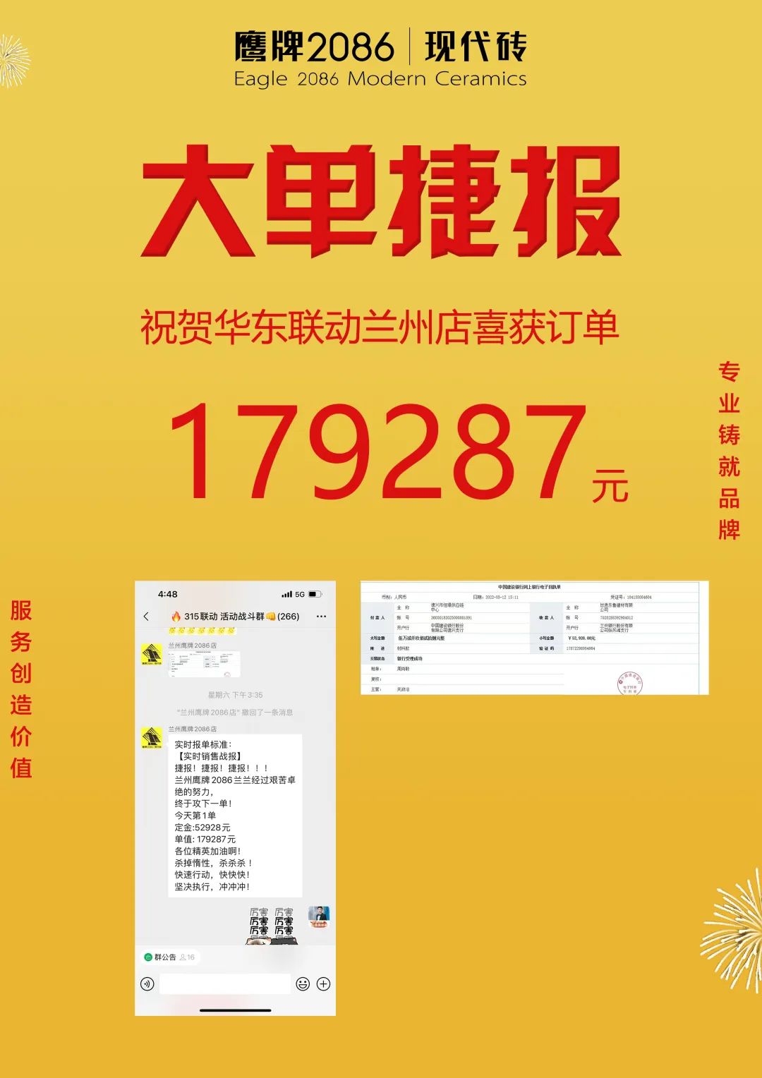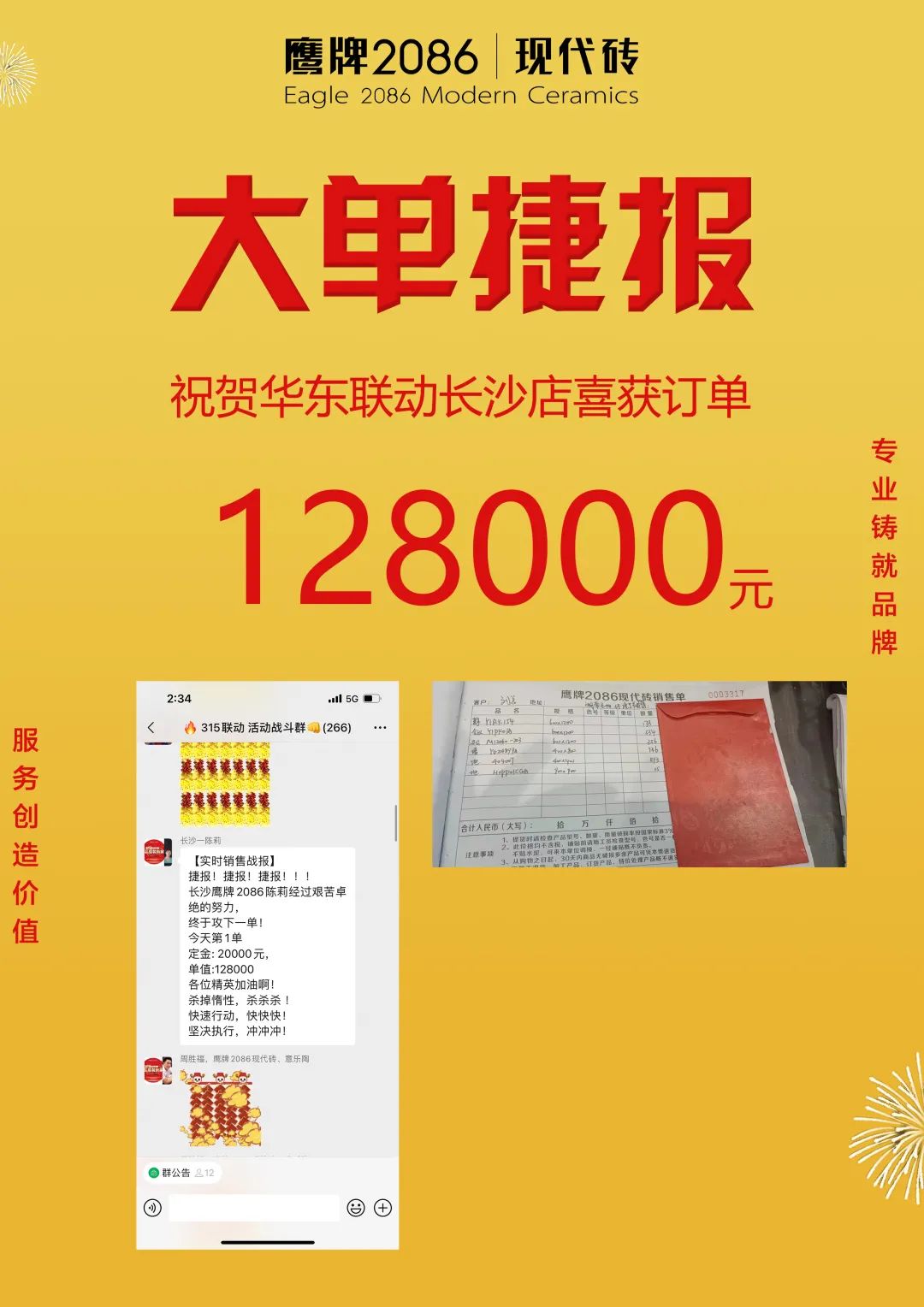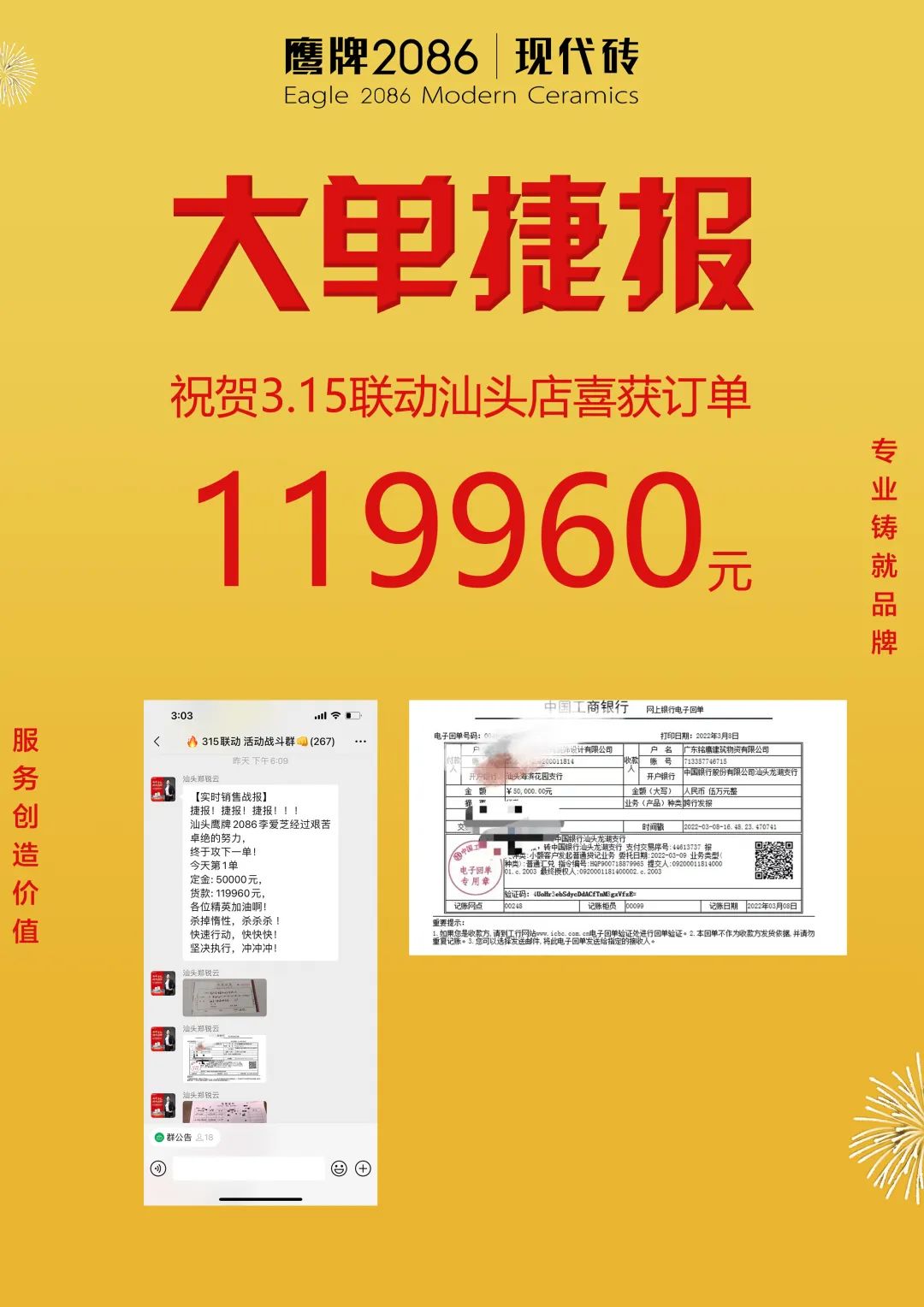 3月1日-20日,由鹰牌2086总部运营部策划的“315品质装新家”全国联动活动圆满收官。在此前315联动启动会上,经过运营部精心策划的线上直播讲解启动,全国门店的家人们都已达成共识,统一目标,一致行动,经过热血奋战,创造了订单额1117.4万的非凡成绩。2022首战告捷,赢得开门红!