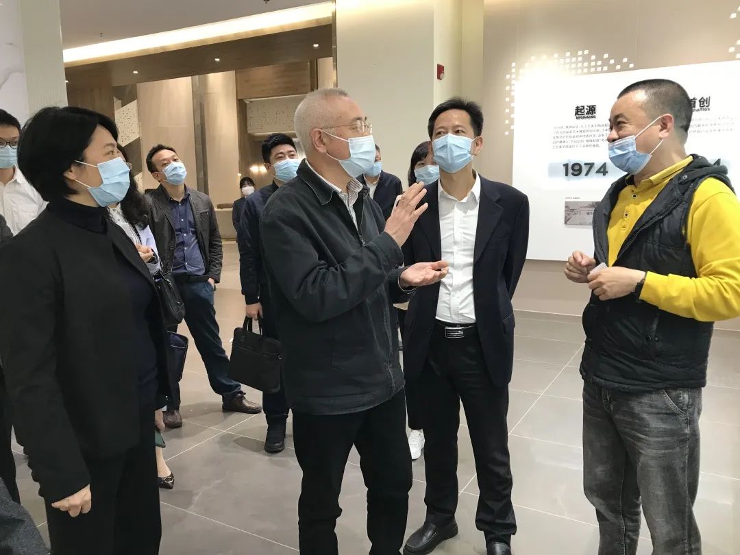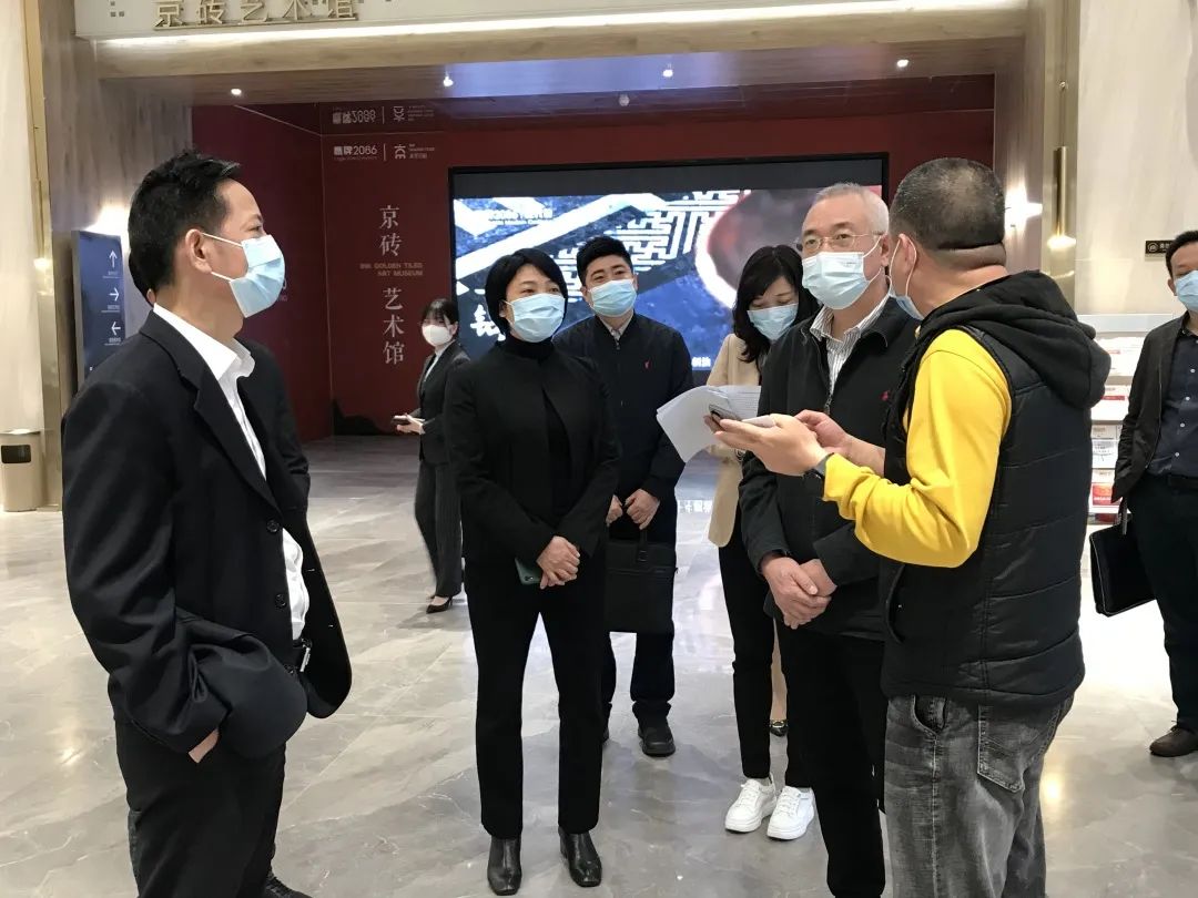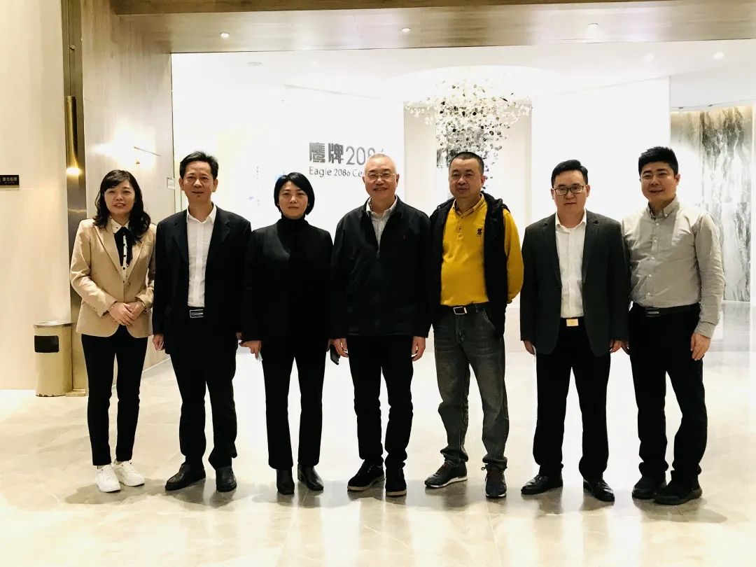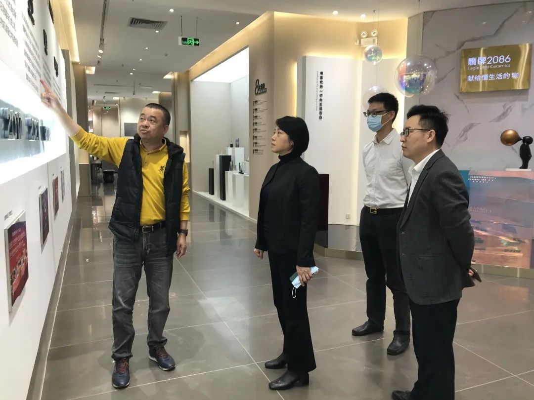 在天安新材、鹰牌实业董事长吴启超的陪同与讲解下,领导一行详细参观了瓷砖一线品牌鹰牌2086品牌展厅,并就鹰牌集团的发展现状及传统企业转型升级进行交流探讨。