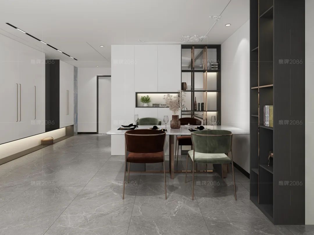 餐厅空间依旧是干净的白色为主,柜体配合半通透设计,视觉上营造扩充感,从客餐厅到房间的走廊也是功能区的分割,开放式展示柜起到区隔作用。灯光连线成面,点亮黑色柜体的典雅独特。