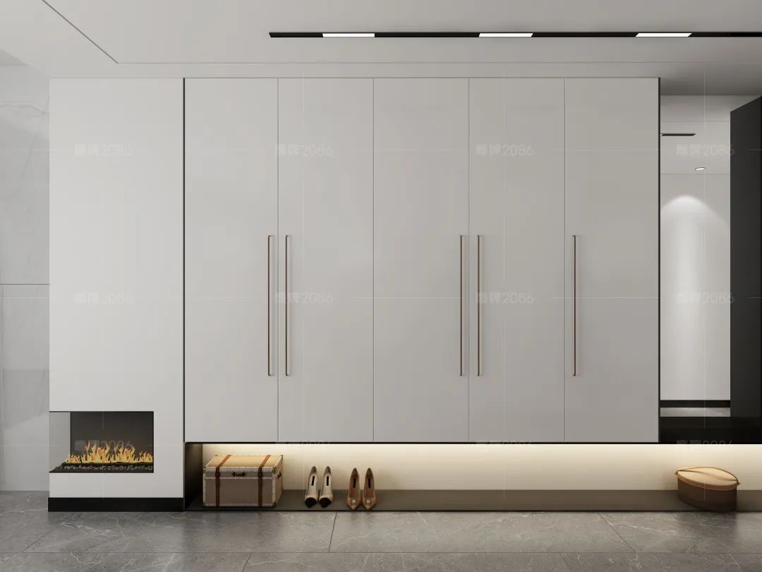 整面白色柜体内嵌穿衣镜,构成了整洁干净的玄关,超大的内容量不仅是鞋柜,也可以是储物柜,下侧内藏暖黄色灯带让换鞋时更安全明亮,壁炉的加入又给极简中带来一丝古典奢华。