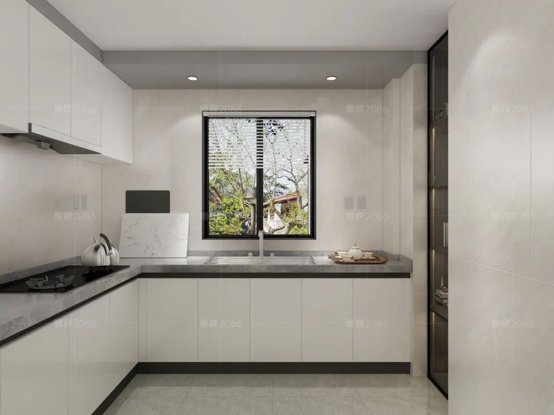 大规格暖色调奢石配合黑白灰的极简,黑色玻璃透出温馨用餐区的暖色灯光,这大概就是为家人烹饪时的幸福感受。